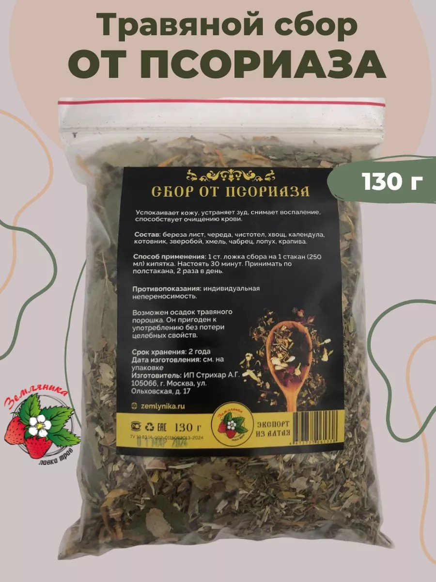 Herbal collection for psoriasis, 130g. Soothes skin, eliminates itching, reduces inflammation, and helps purify the blood. Ingredients: birch leaf, string, celandine, horsetail, calendula, catnip, St. John's wort, hops, thyme, burdock, and nettle. Directions: Add 1 tablespoon of the collection to 1 cup (250 ml) of boiling water. Let it steep for 30 minutes. Take half a glass, 2 times a day. Contraindications: individual intolerance. Sedimentation of the herbal powder is possible. It is suitable for consumption without loss of healing properties.