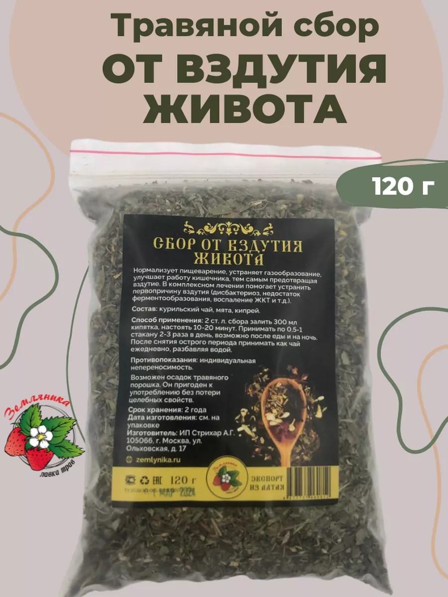 Bloating Herbal Infusion, 120g. Normalizes digestion, eliminates gas, improves bowel function, thereby preventing bloating. As part of a comprehensive treatment, it helps eliminate the underlying cause of bloating (dysbacteriosis, enzyme deficiency, gastrointestinal inflammation, etc.). Ingredients: Kuril tea, mint, fireweed. Directions: Pour 300 ml of boiling water over 2 tablespoons of the infusion and let steep for 10-20 minutes. Take 0.5-1 glass 2-3 times a day, possibly after meals and at night. After the acute period has subsided, take it as tea daily, diluted with water. Contraindications: Individual intolerance. Sediment of herbal powder is possible. It is also suitable for consumption, without loss of healing properties.