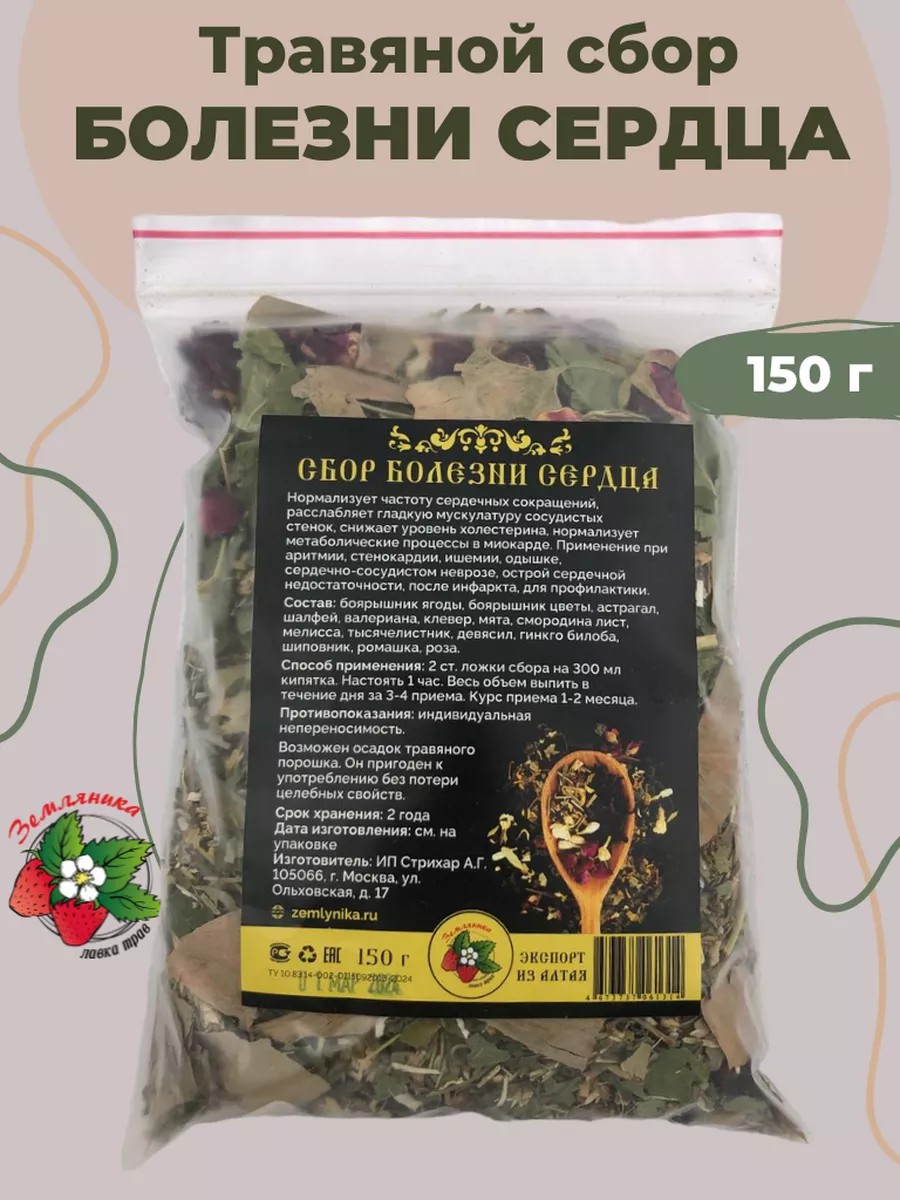 Heart Disease Herbal Collection 150g. Normalizes heart rate, relaxes smooth muscles of vascular walls, lowers cholesterol, and normalizes metabolic processes in the myocardium. Use for arrhythmia, angina, ischemia, shortness of breath, cardiovascular neurosis, acute heart failure, post-heart attack, and for prevention. Ingredients: hawthorn berries, hawthorn flowers, milk vetch, sage, valerian, clover, mint, currant leaf, lemon balm, yarrow, elecampane, ginkgo biloba, rose hips, chamomile, and rose. Directions: Add 2 tablespoons of the mixture to 300 ml of boiling water. Let it steep for 1 hour. Drink the entire mixture throughout the day in 3-4 doses. The course of treatment is 1-2 months. Contraindications: Individual intolerance. Sedimentation of the herbal powder is possible. It is suitable for consumption without loss of medicinal properties.