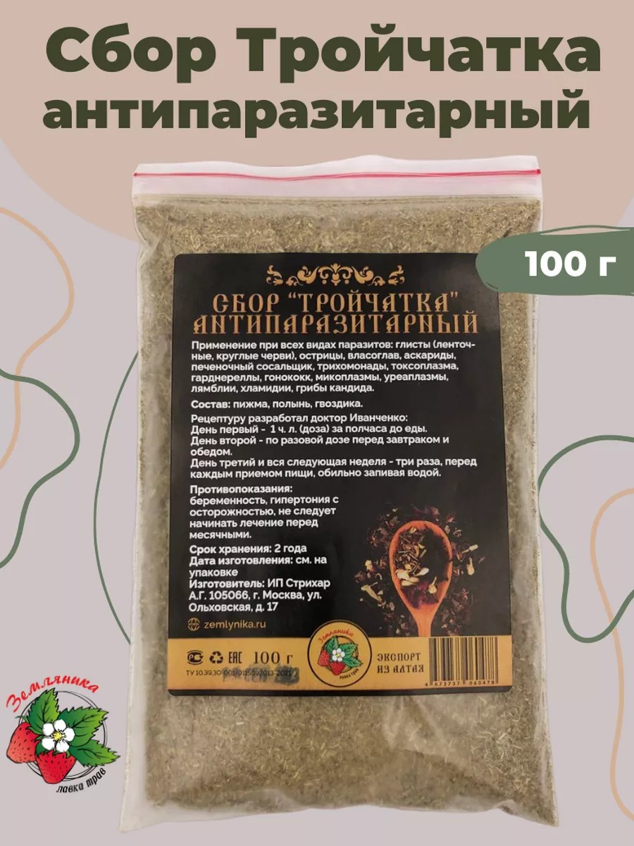 Тройчатка от паразитов и глистов антипаразитарный сбор 100 г – надежное решение для борьбы с паразитами и глистами. Этот уникальный антипаразитарный комплекс поможет вам избавиться от различных видов паразитов и глистов, обеспечивая вашему организму полноценную защиту и восстановление. Тройчатка, также известная как тройчатка русская, тройчатка гинекологическая или тройчатка Иванченко имеет мощное антипаразитарное действие и успешно применяется для избавления от различных видов паразитов. Травяной сбор включает в себя такие травы, как пижма и полынь горькая, обеспечивает усиленное действие и эффективность сбора. Применение этого антипаразитарного сбора рекомендуется при всех видах паразитов, включая глисты (ленточные, круглые черви), острицы, власоглавы, аскариды, печеночные сосальщики, трихомонады, токсоплазмы, гарднереллы, гонококки, микоплазмы, уреаплазмы, лямблии, хламидии и грибы кандида. Этот сбор является идеальным выбором для тех, кто хочет избавиться от паразитов и глистов естественным путем. Состав тройчатки - пижма трава сушеная, полынь горькая трава и гвоздика – три мощных растительных компонента, которые обладают противопаразитарными свойствами. Пижма известна своим антипаразитарным действием и способностью уничтожать паразитов в организме. Полынь горькая обладает противовоспалительными и противопаразитарными свойствами, а гвоздика способствует уничтожению глистов. Рекомендуется следующая схема приема: в первый день необходимо принять 1 чайную ложку за полчаса до еды. Во второй день рекомендуется принимать по ложке перед завтраком и обедом. Начиная с третьего дня и в течение всей следующей недели, сбор следует принимать три раза в день перед каждым приемом пищи, запивая большим количеством воды. Рекомендуется принимать сбор с водой с медом для улучшения вкуса и употребления. Противопоказания: беременность, кормление грудью, гипертония (с осторожностью), перед месячными. Возможен осадок травяного порошка, который не влияет на свойства сбора и может быть безопасно употреблен. Тройчатка от паразитов – это надежное и эффективное средство для борьбы с паразитами и глистами. Природные компоненты этого сбора обеспечивают высокую эффективность и безопасность применения. Не откладывайте заботу о своем здоровье на потом – начните борьбу с паразитами уже сегодня и верните своему организму здоровье и энергию!