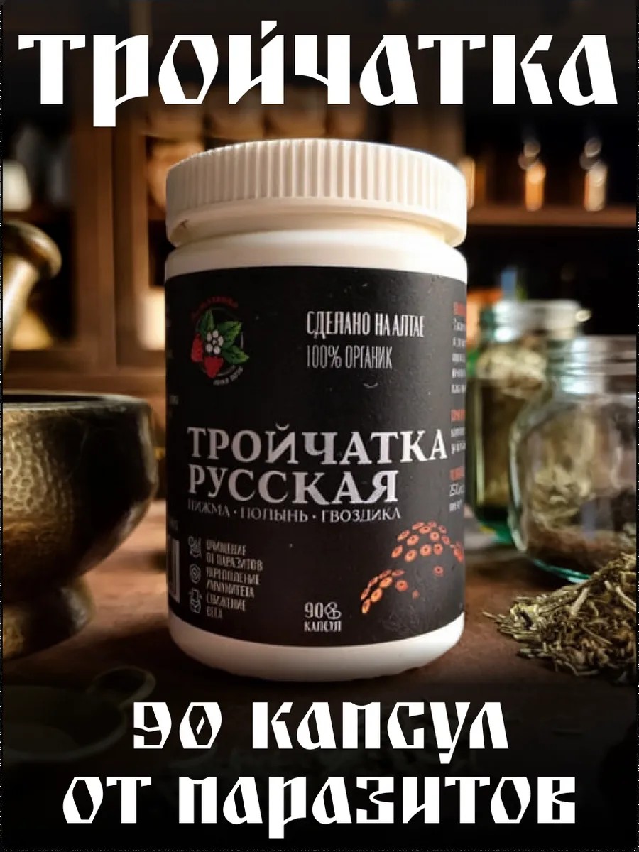 Тройчатка в капсулах – современная русская тройчатка Иванченко, мощный натуральный антипаразитарный комплекс, разработанный для безопасного очищения организма человека от глистов и паразитов. Капсульная форма избавляет от горького вкуса трав и позволяет точно соблюдать дозировку: желатиновая оболочка растворяется в кишечнике, сохраняя активность компонентов и повышая их биодоступность. В формулу входят пижма, полынь горькая и гвоздика – три растения с выраженным противопаразитарным действием. Пижма парализует и выводит круглых и ленточных гельминтов, остриц, власоглавов, аскарид и печёночных сосальщиков; полынь препятствует размножению лямблий, токсоплазм, трихомонад, подавляет рост грибов Candida; гвоздика разрушает яйца и личинки, снижая риск повторного заражения. Такое сочетание позволяет антипаразитарной тройчатке очищать кишечник, печень и желчевыводящие пути, облегчать интоксикацию, улучшать пищеварение и повышать иммунитет. Средство рекомендовано взрослым как профилактика и поддержка при контакте с животными, путешествиях и посещении общественного питания. Капсулы от паразитов удобны дома и в дороге: схема приёма проста – 1-й день три капсулы разом за 30 минут до еды, 2-й день по 3 капсулы утром и вечером, с 3-го по 10-й день по 3 капсулы трижды в сутки; полный курс занимает десять дней, далее 3 капсулы раз в неделю в течение следующих 3-х недель. Упаковка 90 капсул хватает на цикл очищения и остаётся запас на профилактический приём. Тройчатка от паразитов и глистов выпускается без синтетических красителей и ГМО. Противопоказания: беременность, грудное вскармливание, непереносимость компонентов, гипертония – применять с осторожностью; не совмещать с алкоголем и сильнодействующими препаратами. Антипаразитарный сбор не является лекарством, перед началом приёма нужна консультация специалиста. Ищете эффективное натуральное средство от паразитов для человека, чтобы вывести глистов, лямблий и кандиды, вернуть энергию и здоровье ЖКТ? Заказывайте тройчатку антипаразитарную – капсулы против паразитов с классической травяной формулой. По запросам «тройчатка в капсулах купить», «антипаразитарный комплекс», «тройчатка от паразитов», «антипаразитарные капсулы» наш продукт стабильно входит в топ продаж, подтверждая доверие покупателей и эффективность формулы. Комплекс сокращает зуд, дискомфорт, аллергические проявления, улучшает состояние кожи и волос. Тройчатка в капсулах удобна для регулярной детокс-поддержки организма городского жителя, испытывающего стресс, несбалансированное питание и контакт с потенциальными источниками заражения.