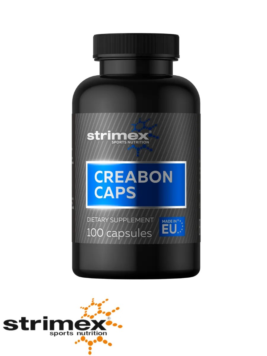 Для чего нужен Creabon-Caps от Strimex? Strimex Creabon-Caps обеспечат значительное увеличение силы, прибавку массы, рост выносливости мышц. Мощные, высокоэффективные продукты для профессиональных атлетов, бескомпромиссные по своему качеству и воздействию на организм. Развитие тренировочных методик и достижения из области спортивного питания помогают раздвинуть границы ваших способностей. STRIMEX sports nutrition позволит вам реализовать свой потенциал на 100%. Все наши продукты подвергаются постоянным мерам контроля для полного исключения даже случайного попадания в них допинга. Strimex Creabon-Caps оказывает непосредственное воздействие на обмен веществ в мышцах. Полученная сила не должна быть утрачена в будущем. Креатин укрепляет мышцы благодаря механизму хранения воды в клетках. За счет этого мышцы становятся не только более плотными, но и твердыми. Креатин участвует в процессе дыхания, который поддерживается благодаря поступлению креатина в организм. Рост показателей невозможен без зарядки мышц креатином. Что такое креатин? Человеческий организм вырабатывает около 1–2 г креатина в день и примерно столько же получает из пищи. Вещество содержится в мышечной ткани всех позвоночных животных. Из-за этого у вегетарианцев концентрация креатина, как правило, ниже, чем у всеядных людей. Около 95% креатина находится в наших мышцах в форме фосфокреатина, остальные 5% — в мозге, печени и почках. В среднем у человека в мускулах хранится 120 ммоль этого вещества на 1 кг сухой мышечной массы, но с помощью добавок его количество можно увеличить на 20–30%. В мускулатуре креатин хранится в форме фосфокреатина. Креатин в качестве пищевой добавки чаще всего продается в виде порошка, который надо разводить жидкостью, либо в капсулах. Также можно найти и другие продукты с ним — например, батончики.