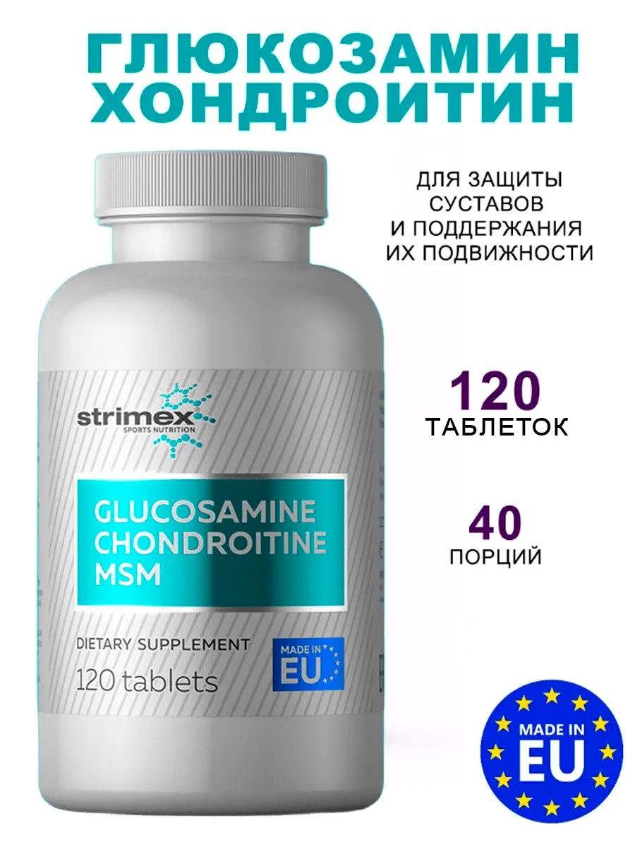 Strimex Glucosamine-Chondroitine-MSM — комплекс хондропротекторов на основе глюкозамина, хондроитина и метилсульфонилметана. Продукты на основе глюкозамина предназначены для защиты суставов и поддержания их подвижности. В качестве диетической добавки они рекомендуются в случае дегенеративных заболеваний (артроз), для улучшения симптомов остеоартрита, для снижения болевых ощущений, ограниченной функциональности суставов как строительный элемент суставов и связок. Глюкозамин и хондроитин являются составными компонентами соединительной ткани и вырабатываются в самом организме. Оба этих вещества также входят в структуру синовиальной жидкости, которая питает хрящи и улучшает скольжение поверхности суставов. Помимо общего улучшения состояния ткани связочного аппарата, глюкозамин и хондроитин способствуют регенерации и улучшению амортизации хрящей. Можно найти огромное количество научных исследований по поводу эффективности этих веществ, причем исследований с участием разных фокус-групп – например, спортсменов или людей с заболеваниями суставов. В целом, можно сделать вывод о том, что глюкозамин и хондроитин оказывают положительное влияние на соединительную ткань и могут использоваться как поддерживающие средства, но не являются полноценными лекарствами. Для сохранения связок и суставов, производится Glucosamine-Chondroitine-MSM – из названия видно, что помимо глюкозамина и хондроитина здесь добавлен метилсульфонилметан (MSM), который часто комбинируется с этими веществами. MSM обладает противовоспалительными свойствами и улучшает проницаемость клеток для доставки питательных веществ, что в совокупности увеличивает эффективность хондроитина и глюкозамина.