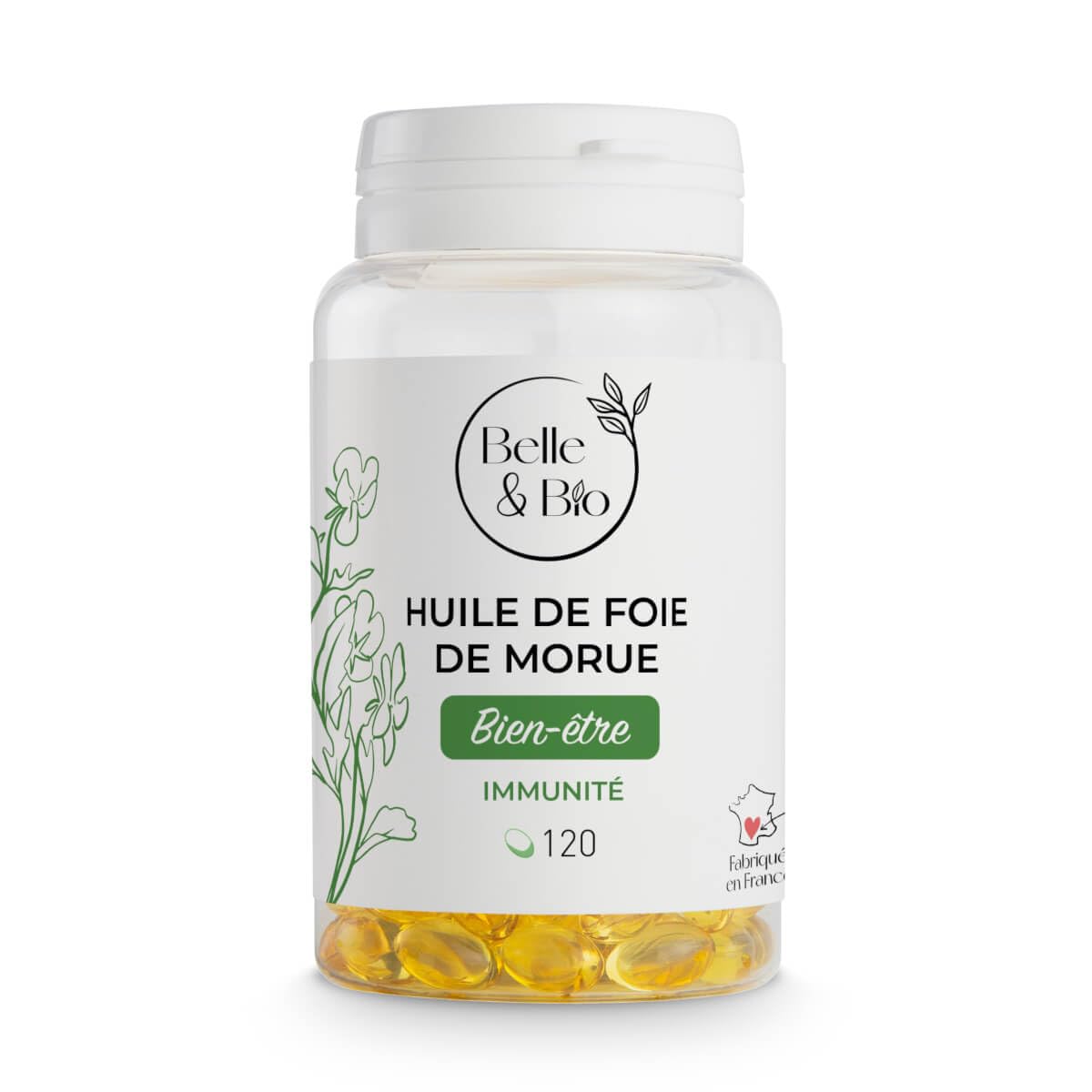 Cod Liver Oil is naturally rich in vitamins A and D. Vitamin A is an antioxidant contributing in particular to bone growth and the regulation of the immune system. It also contributes to good skin health. Concerning Vitamin D, it plays an important role in the mineralization of bone, cartilage and teeth. Belle Bio Cod Liver Oil capsules provide your body with 20 of the NRV in vitamin A and 27 of the NRV in vitamin D. They retain all the properties and nutritional value of this unique oil without the bad taste. 2 capsules per day (540mg) are enough to complete a 2-month treatment. This product is not suitable for vegans and vegetarians (bovine gelatin). Nutritional Reference Value. Store in the refrigerator. INGREDIENTS Ingredients of 2 capsules: Cod liver oil - fish 540mg including Vitamin D3 1.14µg - 22 VNR - vitamin A 97µg - 12 VNR - EPA 37.5 mg - DHA 48.5 mg), Shell: bovine gelatin, Humectant: glycerol, Antioxidant: vitamin E. DIRECTIONS FOR USE Take 2 capsules per day SAFETY WARNING Fish and fish products. It is advisable not to exceed the recommended daily dose. This food supplement should not replace a varied, balanced diet and a healthy lifestyle. Keep out of reach of children. Store in the refrigerator. ✓ FRENCH MANUFACTURE: Our Cod Liver Oil capsules are made in France. This allows us to guarantee strict compliance with current regulations, standards, and labels. ✓ QUALITY AT THE BEST PRICE: Our goal is to guarantee you the best value for money. We check each batch for the presence of pesticides, bacteria, heavy metals, and toxins to offer you Cod Liver Oil of impeccable quality at a low price. ✓ 2-MONTH TREATMENT: Our 120-capsule format is equivalent to a 2-month treatment of Cod Liver Oil (2 capsules day or 540mg). Ideally, we recommend 2 to 3 months of treatment for optimal results. ✓ BENEFITS WITHOUT THE TASTE: The very strong and unpleasant taste can legitimately put many people off consuming Cod Liver Oil. Our capsules allow you to enjoy all the benefits of this product without the discomfort. ✓ RICH IN VITAMINS A D: Our Cod Liver Oil helps strengthen your body and your bones thanks to its richness in Vitamin A (20 of the NRV ) and Vitamin D (27 of the NRV ). This double contribution allows you to benefit from a complete action. ( Nutrient Reference Value). L'Huile de Foie de Morue est naturellement riche en vitamines A et D. La Vitamine A est un antioxydant contribuant notamment à la croissance des os et à la régulation du système immunitaire. Elle contribue également à la bonne santé de la peau. Concernant la Vitamine D, elle joue un rôle important dans la minéralisation de l'os, du cartilage et des dents. Les capsules d'Huile de Foie de Morue Belle Bio vous apporte 20 des VNR en vitamine A et 27 des VNR en vitamine D à votre corps. Elles conservent toutes les propriétés et tout l'apport nutritionnel de cette huile unique sans le mauvais goût. 2 capsules par jour (540mg) suffisent pour réaliser une cure de 2 mois. Ce produit n'est pas adapté aux vegans et aux végétariens (gélatine bovine). Valeur Nutritionnelle de Référence. A conserver au réfrigérateur. INGRÉDIENTS Ingrédients de 2 capsules : Huile de foie de morue - poisson 540mgdont Vitamine D3 1.14µg - 22 VNR - vitamine A 97µg - 12 VNR - EPA 37.5 mg - DHA 48.5 mg), Enveloppe : gélatine bovine, Humectant : glycérol, Antioxydant : vitamine E. MODE D'EMPLOI Prendre 2 capsules par jour AVERTISSEMENT DE SÛRETÉ Poisson et produit à base de poisson. Il est conseillé de ne pas dépasser la dose journalière recommandée. Ce complément alimentaire ne doit pas se substituer à une alimentation variée, équilibrée et d'un mode de vie sain. Tenir hors de portée des enfants. A conserver au réfrigérateur. ✓ FABRICATION FRANCAISE : Nos capsules d'Huile de Foie de Morue sont fabriquées en France. Cela nous permet de vous garantir un respect strict des réglementations, normes et labels en vigueur. ✓ LA QUALITE AU MEILLEUR PRIX : Notre volonté est de vous garantir le meilleur rapport qualité prix. Nous contrôlons pour chaque lot la présence de pesticides, de bactéries, de métaux lourds et de toxines pour vous offrir une Huile de Foie de Morue d'une qualité irréprochable à petit prix. ✓ 2 MOIS DE CURE : Notre format 120 capsules est équivalent à 2 mois de cure d'Huile de Foie de Morue (2 capsules jour soit 540mg). De façon idéale nous vous recommandons 2 à 3 mois de cure pour un résultat optimal. ✓ LES BIENFAITS SANS LE GOÛT : Le goût très prononcé et désagréable peut rebuter légitmement de nombreuses personnes à consommer de l'Huile de Foie de Morue. Nos capsules permettent de profiter de toutes les vertus de ce produit sans les désagréments. ✓ RICHE EN VITAMINES A D : Notre Huile de Foie de Morue contribue à fortifier votre organisme et votre ossature grce à sa richesse en Vitamine A (20 des VNR ) et en Vitamine D (27 des VNR ). Ce double apport vous permet de bénéficier d'une action compléte. ( Valeur Nutrionnelle de Référence).