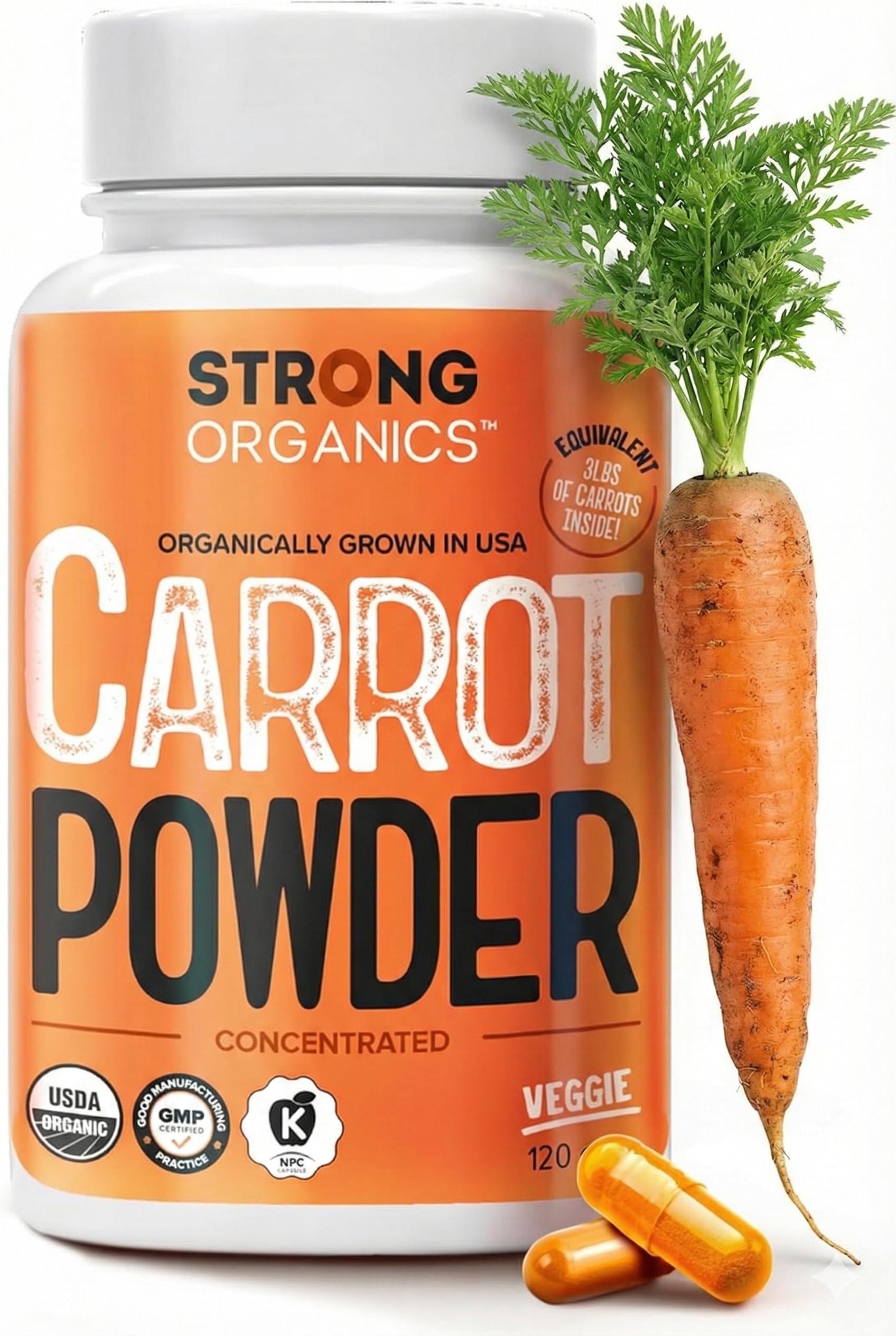 USDA Organic, Kosher, vegan carrot powder capsules with no fillers or additives, USA grown