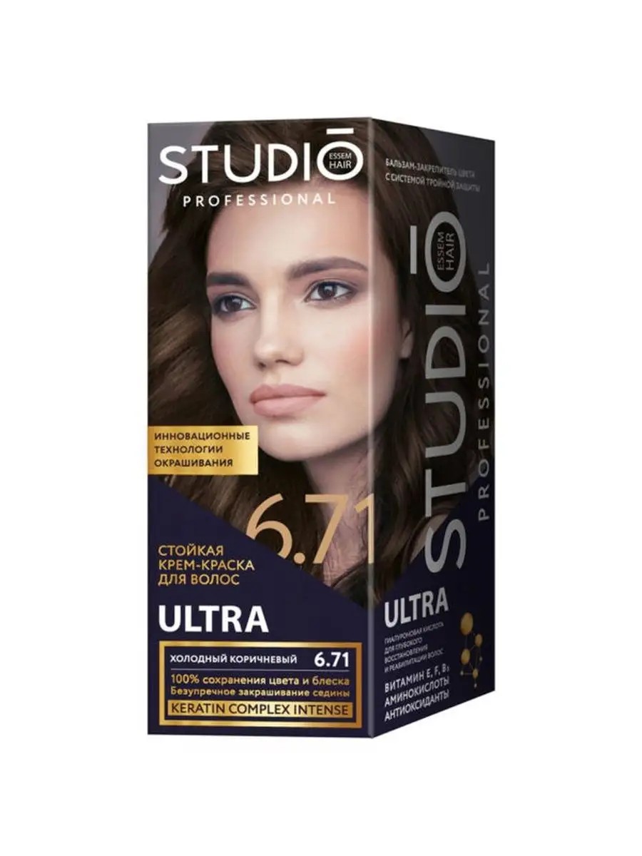 STUDIO professional 50/50/15 ml 6.71 Cool brown for gray hair. : Ultra, a highly durable cream color for gray hair, is the first moisturizing cream color enriched with vitamins, amino acids, and hyaluronic acid, providing flawless, vibrant color and a glossy shine. The perfect formula delivers intense pigments deep into the hair for 100% gray coverage, while the caring color-fixing balm ensures ultra-long-lasting color. The exclusive Time Rewind complex has exceptional biodistribution, allowing active ingredients to penetrate all layers of the hair.