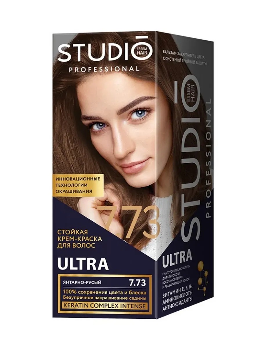Studio Professional Крем-краска для волос Ultra тон 7.73 Янтарно-русый, 115 мл. Цвет волос «Янтарно-русый» ненавязчиво подчеркнёт Вашу природную красоту! Невероятный блеск, стойкость цвета и полное закрашивание седины! Особо стойкая крем-краска для седых волос ULTRA с гиалурованной кислотой. Совершенная формула транспортирует интенсивные пигменты глубоко в волос для 100 % закрашивания седины и стойкости более 15 недель. Эксклюзивный комплекс в сочетании с витаминами E, F, B5 и антиоксидантами оказывает реконструирующее действие, преображает и выравнивает поверхность волос. Волосы максимально защищены, увлажнены и наполнены жизненной энергией.