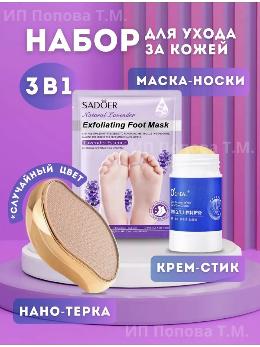 Подарочный набор косметики «Красивые ножки» будет отличным подарком к любому празднику для каждой представительницы прекрасного пола. Комплектация готового набора косметики включает в себя три предмета: Крем-стик ( от трещин,шелушения и обветривания), Нано-терка (удаляет огрубевшую кожу), Маска-носки (увлажняет и питает).Подарочный набор по уходу за ножками - идеальный подарок на любой праздник!Крем для стоп против трещин - истинный хранитель красоты и здоровья, созданный для активного ухода за вашей кожей. Позвольте себе погрузиться в мир увлажнения, восстановления и комфорта с этим превосходным продуктом. Многослойная защита рук, ног и тела стала возможной благодаря уникальному составу стика. Каждый участок вашей кожи заслуживает лучшего, и этот стик спроектирован для того, чтобы дарить вам нежность и омолаживающий эффект. Сухость, трещины и шершавость больше не будут беспокоить вас. Практичный формат стика делает использование максимально удобным и простым. Просто нанесите его на желаемые участки кожи, и мгновенно почувствуйте, как паста нежно тает, обволакивая вас нежной заботой. Независимо от места на вашем теле, этот крем-стик обеспечивает интенсивное увлажнение, придавая вашему телу гладкость и шелковистость. Особенно рекомендуется использовать восстанавливающий крем против трещин для ухода за чувствительными участками. Нежная кожа рук, пяток, а также область вокруг крыльев носа нуждаются в особом внимании, и этот гель готов обеспечить им необходимую защиту. Вы получите постоянное восполнение влаги, что снижает риск пересыхания, сохраняя ее упругой и здоровой. В то же время, он помогает укрепить кожный барьер, обеспечивая долговременную защиту от агрессивных факторов окружающей среды. Впервые встречаясь с этим стиком, вы познаете ощущение истинного увлажнения и расслабления. Мазь борется с сухостью и дискомфортом, возвращая живительную гармонию.