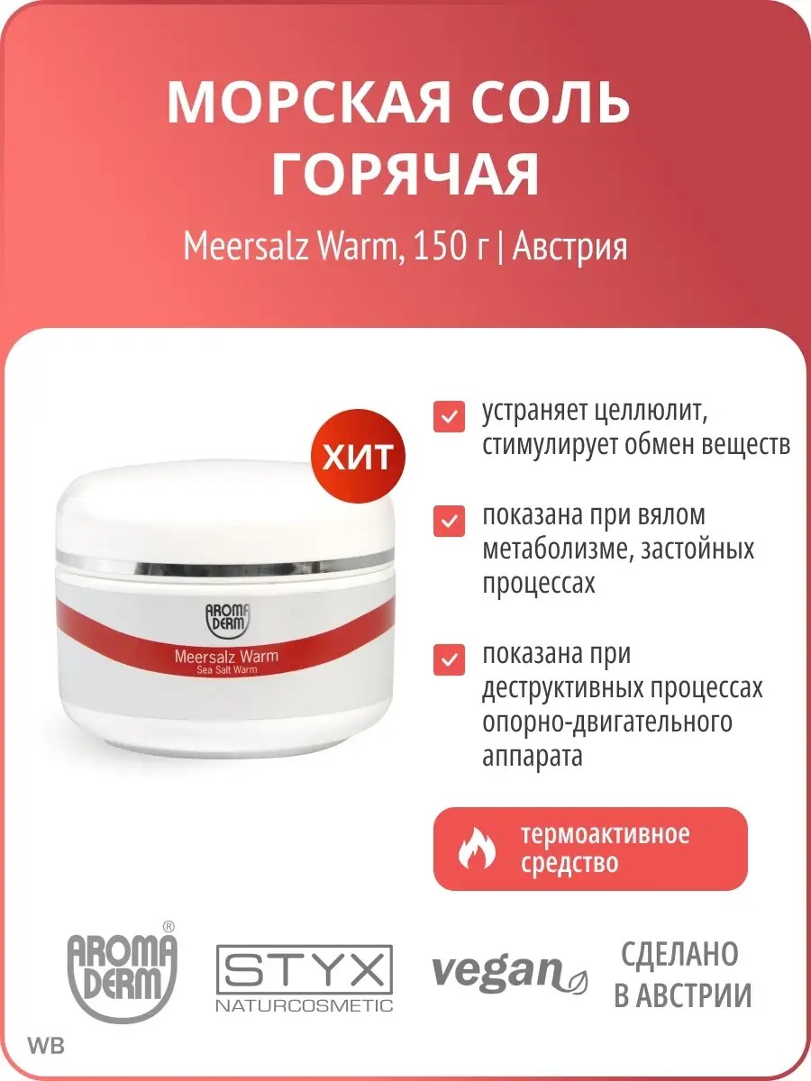 Горячая морская соль оказывает липолитическое, рассасывающее, миотоническое действие, устраняя фибринозные формы целлюлита. Стимулирует микроциркуляцию, обмен веществ, активизирует гемодинамику. Сжигает жир, устраняя последствия переедания. Показана при высоких стадиях целлюлита, ожирении, спазмах, болевом синдроме, деструктивных процессах опорно-двигательного аппарата (артрозы, остеохондроз), вялом метаболизме, застойных процессах, включая и хронические воспаления. Применяется в комплексной терапии ряда кожных болезней (акне, фурункулез, старение).Ее применяют в процедурах водолечения, используют для терапевтических компрессов (при травмах, болях, застойных процессах, подострых воспалениях) и для приема лечебных ванн.