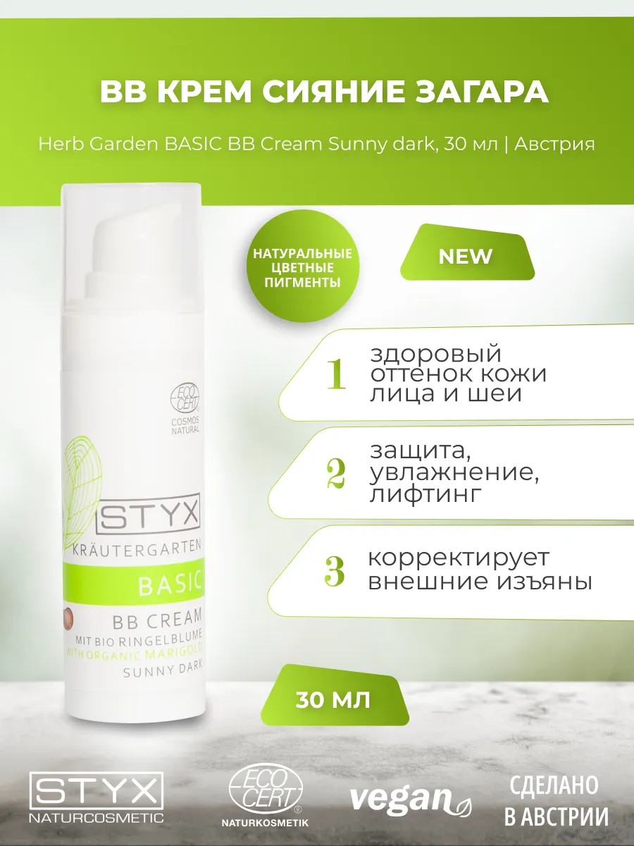 ВВ-крем «Сияние загара», 30 МЛ. Полноценный дневной уход за загорелой кожей (защита, увлажнение, лифтинг) с эффектом nude-макияжа и коррекцией внешних изъянов. Средство придает гомогенную текстуру и здоровый оттенок коже лица и шеи, корректируя такие эстетические несовершенства, как сосудистый рисунок (купероз), прыщики, травмы, пигментные пятна и тени под глазами. Пигментированный крем BB-класса сочетает важнейшие косметические функции дневных кремов – питание, увлажнение, защиту клеток от воздействия агрессивных факторов внешней среды (солнце, ветер, смог, пыль) – с транспарентным (полупрозрачным) декоративным эффектом здорового свечения кожи лица. Органический ВВ-крем выравнивает текстуру кожи с помощью каприловой кислоты, смолы сенегальской акации и частичек слюды, а цвет – с помощь пигментов диоксида титана, римской (голубой) ромашки и оксида железа. В составе ВВ-кремов STYX в качестве компонентов ухода применяются масла сои и ши (карите), воск жожоба, сок алоэ, экстракт календулы и, конечно, эфирные масла герани, шалфея и фенхеля. Для вечернего умывания, чтобы удалить легкую невязкую текстуру ВВ-крема с кожи, подходит и очищающее молочко, и натуральные виды мыла, и цветочная вода (роза, лаванда), и тоники.