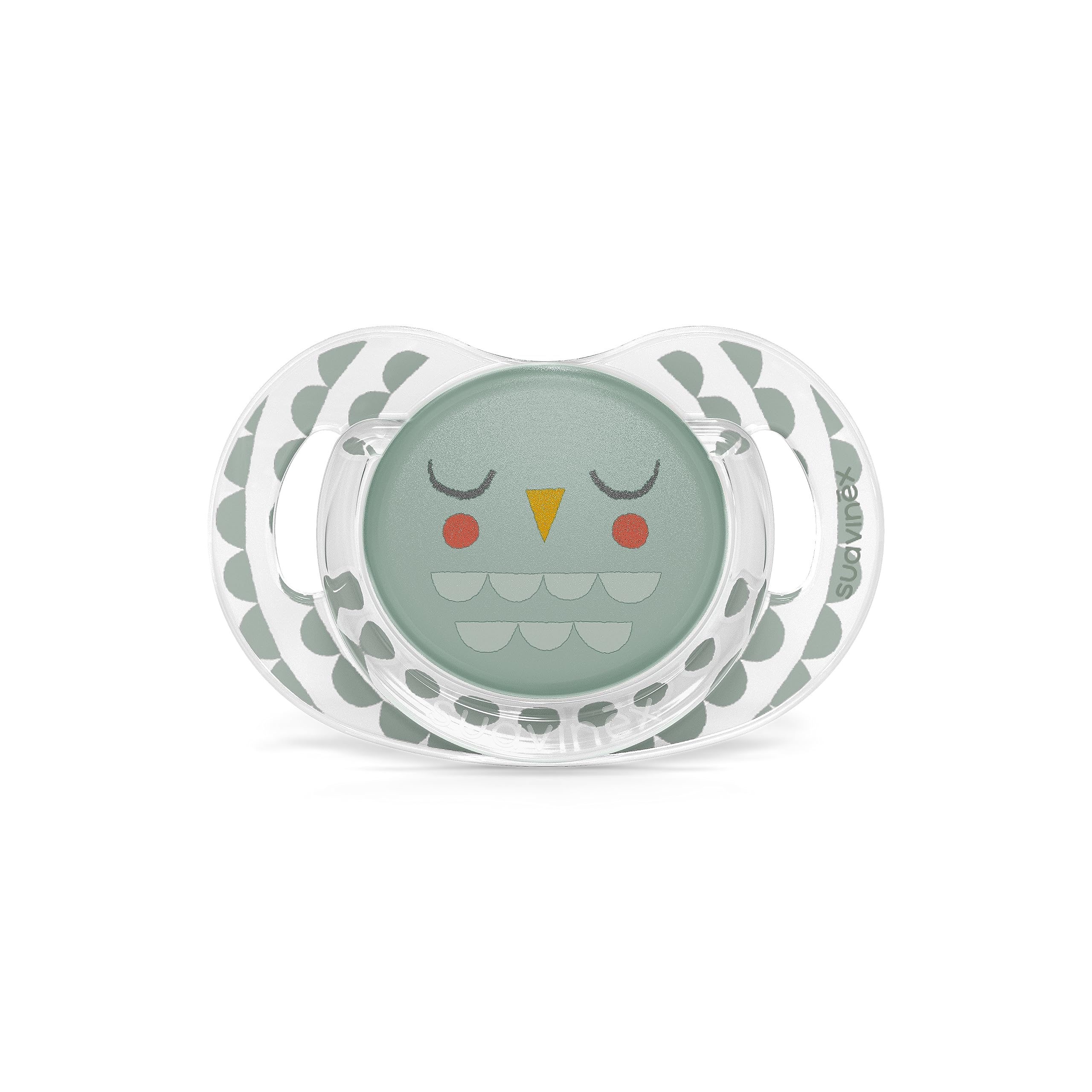 What a delightful pacifier from the Suavinex Bonhomia collection!This beautiful pacifier is suitable for children from 18+ months and has a very sweet design with an owl.With a Suavinex pacifier you go to quality and are guaranteed to be a good, safe pacifier for your child.This pacifier has an anatomical form.This pacifier is made of silicone and is free of BPA.The shape of the teats has several advantages.It ensures that your child easily accepts the pacifier and because the flat pacifier fits perfectly with your child's palate and helps the development of tongue and jaw muscles.The shield also has ventilation holes that prevent skin irritation around your child's mouth.Properties: * Suavinex Bonhomia 18m+ silicone pacifier * Design: Feather * Color: Green * Age: 18+ months * Anatomical pacifier * Easy accepted and good for the pine and tongue muscles * shields with ventilation holes prevents skin irritation * Material: silicone pacifier