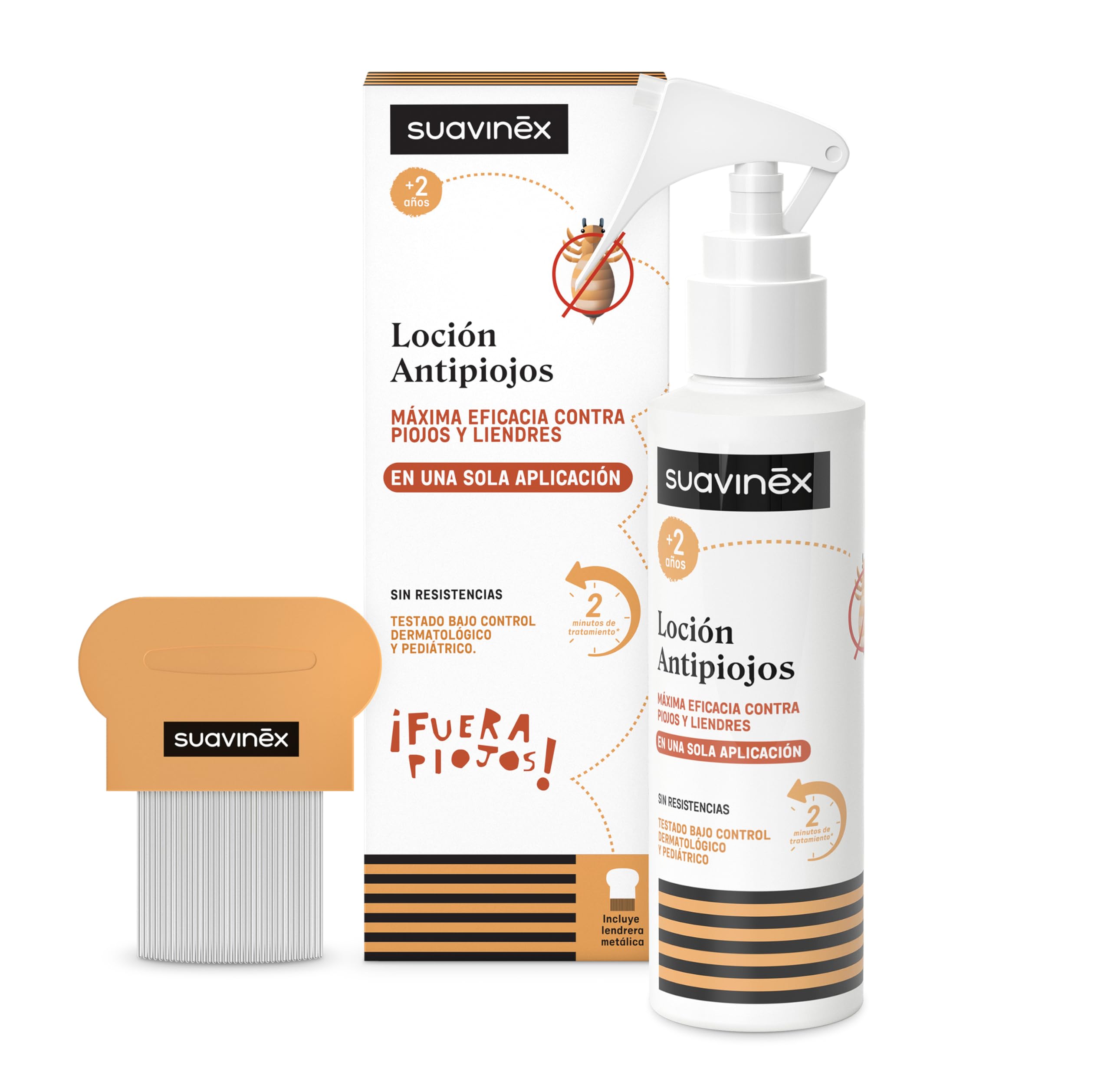 Suavinex Anti-Lice Lotion, non-resistance, maximum effectiveness against lice and nits in a single application. Suavinex Anti-Lice Lotion is a safe treatment against lice and nits. Respects the hair's natural moisture. Minimizes the risk of scalp irritation. Does not create resistance after multiple applications. Formula with an exclusive combination of isopropyl myristate and denatured ethanol. Spray format. Includes a lantern. Proven effectiveness. Eliminates 100 of lice in just 2 minutes. Eliminates 100 of nits in just 10 minutes. Tested under dermatological and pediatric control. Does not damage or make hair greasy, leaving it soft and shiny. Gentle on the scalp. Easy to use. Suavinex anti-lice lotion is a pediculicide that works against live lice and nits (eggs), eliminating them by suffocation and dehydration, without creating resistance. Its formula guarantees high efficacy without damaging or making hair greasy. It is effective for adults and children from 2 years old. Instructions for use: 1. It is recommended to begin treatment only when live lice are visible. Apply the lotion to dry hair, saturating the roots and scalp until thoroughly wet, paying particular attention to the nape of the neck and behind the ears. A cap is not necessary. 2. Gently massage with your fingertips and leave on for 10 minutes (this will also ensure the elimination of nits). 3. Comb through the hair with a rake from roots to ends to remove dead lice and nits after treatment. 3. To remove the product, apply the shampoo directly to the hair without pre-wetting or rinsing (as the product repels water). Rub the shampoo into the hair and rinse thoroughly with water. If necessary, repeat the washing process to remove all of the product. In case of persistent infestation, repeat the same treatment after 7 days. Do not use on individuals sensitive to its components. If other lice treatments have been used previously, wash your hair thoroughly with a cosmetic shampoo. Do not mix different lice treatments. It is recommended to use a strip rake or a fine-toothed comb with strong teeth to remove nits. The infested person should use shower caps, combs, towels, etc., for individual use. Warnings: Highly flammable liquid and vapor. Keep out of reach of children. Avoid contact with eyes, mucous membranes, and sensitive or damaged skin. In case of contact with eyes, rinse immediately and thoroughly with water. Do not use on children under 2 years of age. If medical advice is needed, have the packaging or label at hand. Ingredients: Isopropyl myristate, caprylyl methicone, alcohol denat., isopropyl alcohol, isostearyl alcohol, butylene glycol cocoate, ethylcellulose, PEG PPG-10 1 dimethicone, ethylhexyl polyhydroxystearate, benzyl alcohol. INGREDIENTS Isopropyl myristate, caprylyl methicone, alcohol denat., isopropyl alcohol, isostearyl alcohol, butylene glycol cocoate, ethylcellulose, PEG PPG-10 1 dimethicone, ethylhexyl polyhydroxystearate, benzyl alcohol DIRECTIONS 1. Apply the lotion to dry hair, saturating the roots and scalp until thoroughly wet, paying particular attention to the nape of the neck and behind the ears. 2. Gently massage with your fingertips and leave on for 10 minutes. 3. Comb through hair with a hair clipper from roots to ends to remove dead lice and nits after treatment. 4. To remove the product, apply shampoo directly to the hair without wetting or rinsing it first. Rub through hair and rinse thoroughly with water. SAFETY WARNING Highly flammable liquid and vapor. Keep out of reach of children. Avoid contact with eyes, mucous membranes, and sensitive or damaged skin. In case of contact with eyes, rinse immediately and thoroughly with water. Do not use on children under 2 years of age. If medical advice is needed, have product container or label at hand. See moreIncludes a metal magnifying glass. For easy removal of dead lice and nits attached to the hair. Does not leave hair greasy or damaged. The lice spray does not damage or make hair greasy and leaves it soft and shiny. Safe treatment. Dermatologically and pediatrically tested. Respects the hair's natural moisture and minimizes the risk of scalp irritation. Does not create resistance after multiple applications. Exclusive natural and gentle formula that combines isopropyl myristate, to eliminate lice and nits, and denatured ethanol to remove oily residue and facilitate styling. Eliminates 100 of lice and nits. Maximum effectiveness against lice and nits in a single application. Eliminates 100 of lice in just 2 minutes and 100 of nits in just 10 minutes. Lice and nit treatment. 125 ml spray lotion. For a comfortable, easy and safe application.Suavinex, Pack Lotion anti-poux et toiles Lendrera, élimine 100 des poux et des toile, traitement sûr, efficace, n'abîme pas les cheveux, n'irrite pas, ne pénètre pas, testé, 2 ans, format sprayDESCRIPTION DU PRODUIT DESCRIPTION DU PRODUIT Lotion anti-poux de Suavinex, sans résistance, efficacité maximale contre les poux et les lentes en une seule application. La lotion anti-poux de Suavinex est un traitement sûr contre les lentes et les poux. Respecte l'hydratation naturelle des cheveux. Minimise le risque d'irritation du cuir chevelu. Ne crée pas de résistance après plusieurs applications. Formule avec combinaison exclusive de myristate d'isopropyle d'éthanol dénaturé. Format spray. Comprend une lanterne. Efficacité testée. Élimine 100 des poux en seulement 2 minutes. Élimine 100 des lentes en seulement 10 minutes. Testé sous contrôle dermatologique et pédiatrique. Sans endommager ou graisser les cheveux, les laissant doux et brillants. Doux pour le cuir chevelu. Facile à utiliser. La lotion anti-poux Suavinex est une lotion pédiculicide qui agit contre les poux vivants et les lentes (œufs), en les éliminant par l'étouffement et la déshydratation, sans créer de résistances. Sa composition garantit une grande efficacité sans endommager ni graisser les cheveux. Il est effica