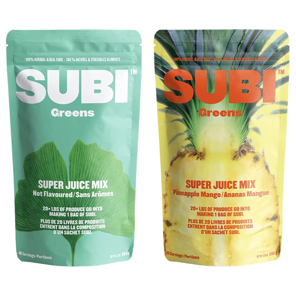 SUBI Best Green Superfood NOT FLAVOURED VEGETABLE AND DAILY GREENS REPLACEMENT Raw Ingredients: Matcha, Kale, Barley Grass, Spirulina, Acai, Goji Berry + More Morning Energy Booster 40 Day Supply We try our best to fuel our bodies with leafy greens and nutrition that comes from all-natural sources, but sometimes life just gets in the way. We made Subi so that natural nutrition could be convenient and accessible to everyone. A serving of Subi in the morning provides you with 4 servings of nutrient dense greens and >60% of your daily nutrition. There’s something freeing knowing that you started off your day covering most of your nutritional needs. We make eating your veggies simple: just scoop, mix and sip! Mix one tiny, 7-gram serving of Subi into 375mL or more of your favourite morning beverage (water, tea, smoothie – dealer’s choice!) and fuel yourself with all-day energy. Subi | Best Green Superfood – Pineapple Mango | Raw Ingredients: Matcha, Kale, Barley Grass, Spirulina, Acai, Goji Berry + More | Morning Energy Booster | 40 Day Supply We try our best to fuel our bodies with leafy greens and nutrition that comes from all-natural sources, but sometimes life just gets in the way. We made Subi so that natural nutrition could be convenient and accessible to everyone. A serving of Subi in the morning provides you with 4 servings of nutrient dense greens and >, 60% of your daily nutrition. There’s something freeing knowing that you started off your day covering most of your nutritional needs. Subi Super Juice, Pineapple Mango, 301 Grams (Pack of 1).Product 2: Subi is nutrient dense because our vegetables are picked exactly when nature intended. The vegetables at the market are often picked two - six weeks too early so they won’t spoil while being shipped to the market, which is why they simply aren’t as nutritious. Product 2: The Perfect Blend. Each serving represents more than 60% of daily nutrition and contains carefully selected superfoods for all-natural energy. Expect to experience improvements in mood, energy, digestion, complexion, and overall wellness. Product 2: Subi is ALL NATURAL Nutrition - It takes 20 pounds of farm fresh fruits and vegetables and 40 hours in a low heat dehydrator just to make 1 bag. We don’t add any chemicals, artificial flavoring, or lab made vitamins to trump up our nutritional profile. Product 2: Pineapple Flavoured - Some people just don’t like how strong our original subi is, so this naturally flavoured pineapple product helps you enjoy the benefits of subi without the strong earthy taste. Product 1: We’re OBSESSED With Quality. Every ingredient was carefully sourced, every supplier was meticulously vetted and every batch is tested. Subi is a result of our obsession over quality. We refuse to sell a product that we wouldn’t take ourselves. Product 1: Subi is nutrient dense because our vegetables are picked exactly when nature intended. The vegetables at the market are often picked 2 to 6 weeks too early so they won’t spoil while being shipped to the market, which is why they simply aren’t as nutritious (292). Product 1: The Perfect Blend. Each serving represents lesser than 60% of daily nutrition and contains carefully selected superfoods for all natural energy. Expect to experience improvements in mood, energy, digestion, complexion and overall wellness. Product 1: Subi is ALL NATURAL Nutrition. It takes 20 pounds of farm fresh fruits and vegetables and 40 hours in a low heat dehydrator just to make 1 bag. We don’t add any chemicals, artificial flavoring or lab made vitamins to trump up our nutritional profile.