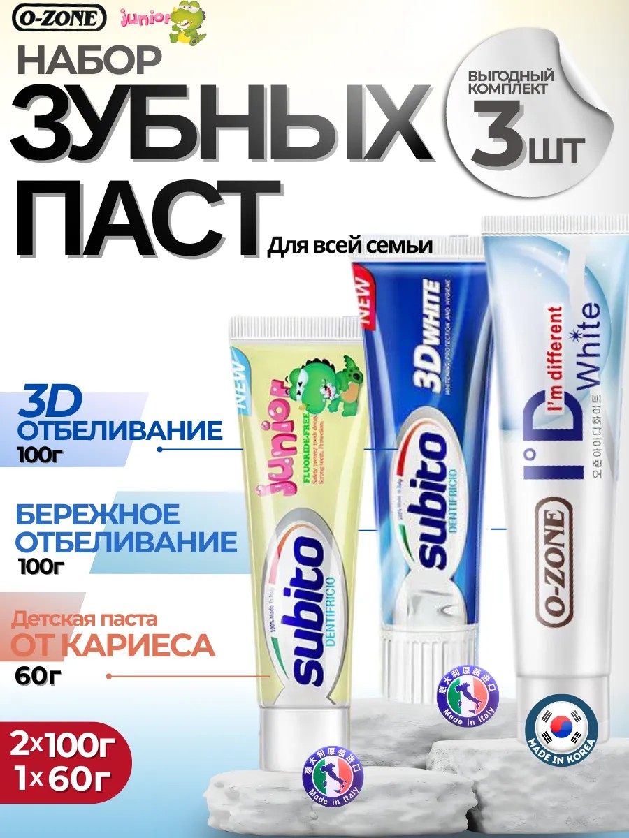 Детская паста Subito Junior с фторидом укрепляет зубы, предотвращает кариес и обеспечивает надёжную защиту полости рта, подходит для детей от 3 лет. Она безопасна, приятна на вкус и помогает формировать привычку к регулярной гигиене. Все пасты из набора производятся по международным стандартам качества: детская паста произведена в Италии, а две взрослые — в Корее, что гарантирует высокое качество и безопасность. Упаковка удобна для хранения и транспортировки, а наличие трёх разных формул позволяет выбрать оптимальный вариант для каждого члена семьи. Набор идеально подходит для домашнего использования, путешествий или в качестве подарка. Он подойдёт тем, кто ищет экономичный комплект зубных паст, набор для всей семьи, зубную пасту с фтором, пасту от кариеса, пасту для детей с фтором, пасту для отбеливания, пасту с 3D эффектом, пасту для бережного отбеливания, пасту для чувствительных зубов и пасту для ежедневного ухода. Благодаря сочетанию эффективности, безопасности и доступной цены, этот набор стал популярным выбором среди покупателей, ценящих качественный уход за полостью рта.
