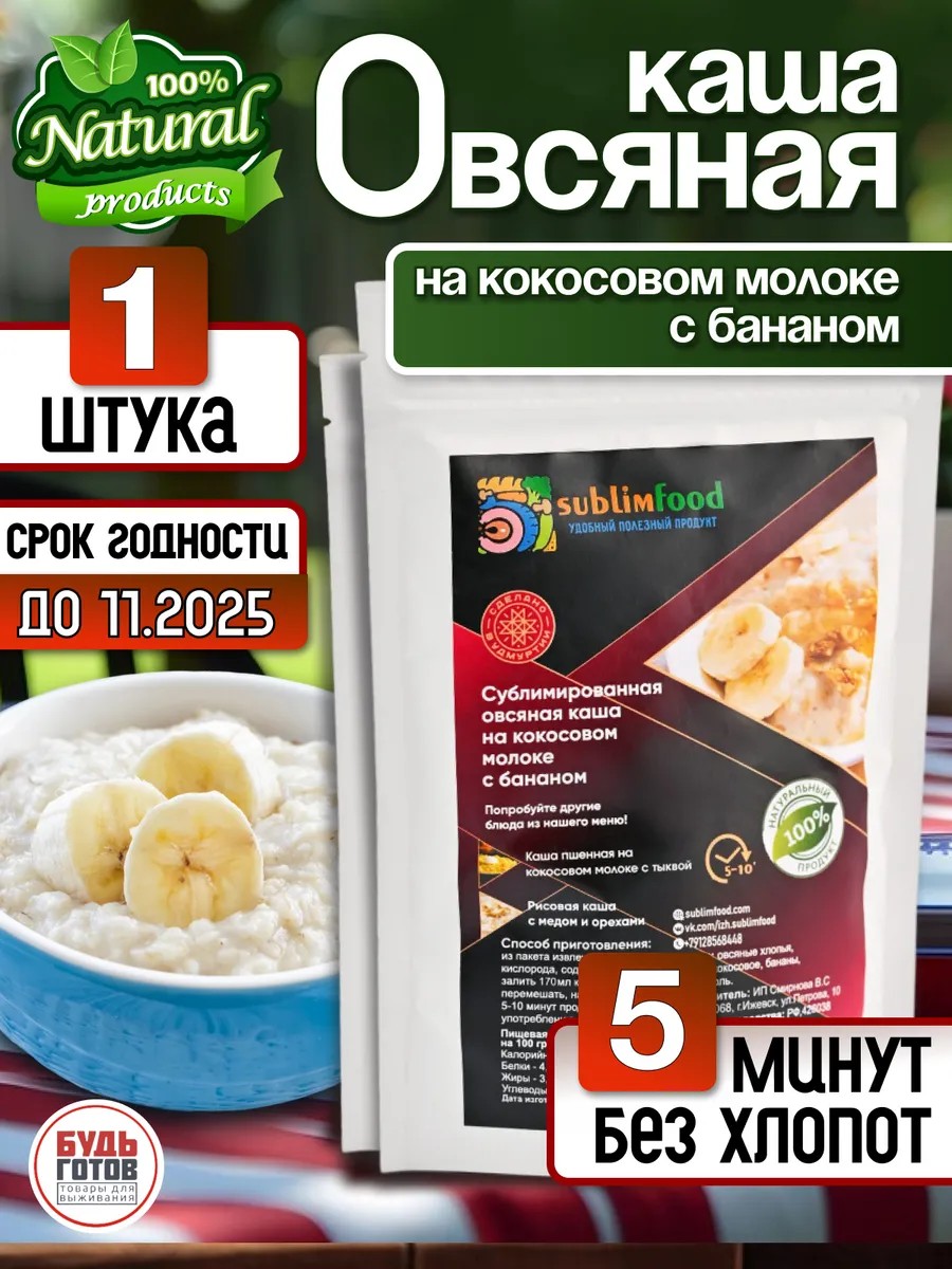 | Комплектация | продукты; Еда в поход; готовые блюда; сублимированная еда; не требует варки; просто залить водой; туристическое питание; овсяная каша; Каша быстрого приготовления; овсяная каши бананом; каша; готовая каша |