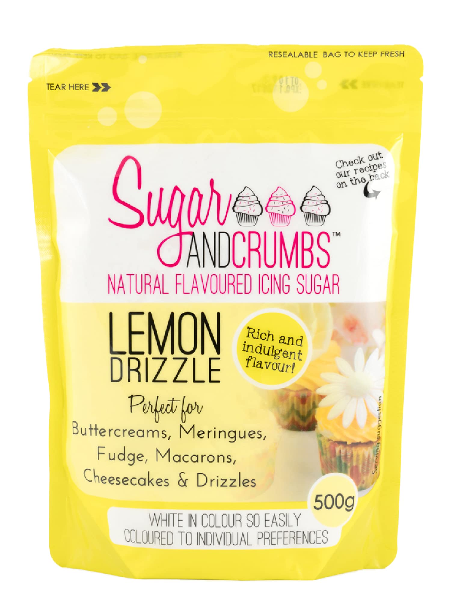 It is a versatile product and works very well in your sponge cake or meringues, as a buttercream or drizzled over your traybake as a fondant. With a fresh, vibrant citrus flavour balanced by the sweetness of the sugar, it's easy to see why this is one of our bestselling icing sugar products in the range. Lemon Drizzle Natural Flavoured Icing Sugar by Sugar and Crumbs remains white in colour allowing you to colour if you wish or remain plain to give your customer an unexpected flavour surprise! Key Benefits Natural Flavouring Achieve consistent flavour every time. Perfect for butter creams, icings, macaroons and dusting A fantastic range of professional confectioners flavoured icing sugars. These flavoured options are perfect for butter creams, chantilly creams, meringues, icing and even flavoured royal icing. It is Suitable for Vegetarians and Vegans. Also, it is Free from nuts, lactose and gluten. US-FDA Certified for Human Consumption when used in Bakery Products, Dough Mixes or Icing INGREDIENTS Icing Sugar, Anti-caking agent E341, Starch (trace), Natural Flavourings, Carriers (Maltodextrin, Gum Arabic) DIRECTIONS If you have a 250g bag of Sugar and Crumbs Icing Sugar, use 125g of butter. If you have a 500g bag of Sugar and Crumbs Icing Sugar, use 250g of butter. BOX CONTAINS 500 Grams of Lemon Drizzle Icing Sugar See more