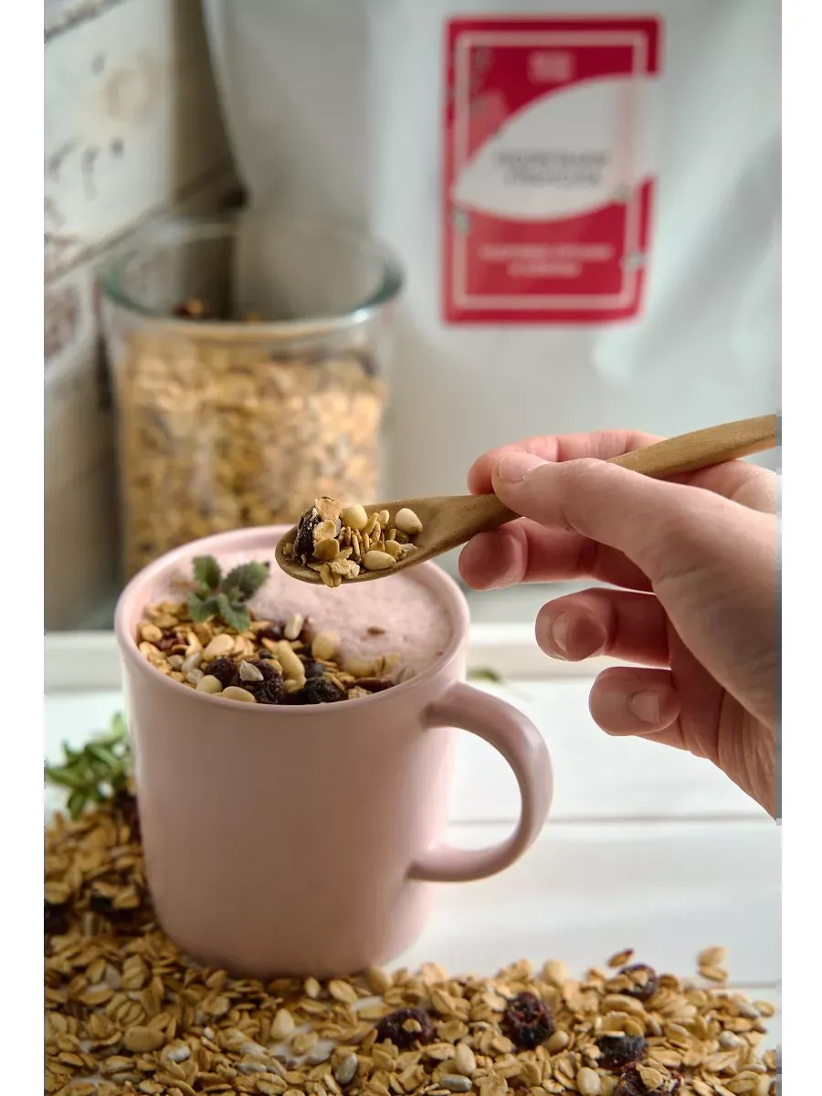 We've combined pine nuts and cranberries in this incredibly delicious granola. A large package for the whole family—20 servings. A Lenten meal suitable for Lent. Fruit, dried sugar-free muesli, and cereal—all contribute to proper nutrition and a healthy menu. Sugar-free granola is very similar to baked muesli, but it's much tastier, thanks to the preparation method. It's baked until crispy and flavored with honey. It's so nice when a healthy diet is also delicious. Sugar-free and gluten-free. Nastya Slastin's sugar-free granola is a healthy menu and a very versatile product that's beneficial for the gut. It's suitable for weight loss programs, detox programs, and fitness nutrition. You can add it to cottage cheese, porridge, or ice cream. There are countless ways to use it. In addition to its standard use as a healthy breakfast or afternoon snack, it's traditionally taken on hikes because it's lightweight and keeps well. Suitable as a healthy snack, a sugar-free healthy snack, a healthy diet, fitness nutrition, protein-rich sweets, and a cereal for both fitness and weight loss. Find your perfect use and experience the taste of this healthy sweet from Russia.