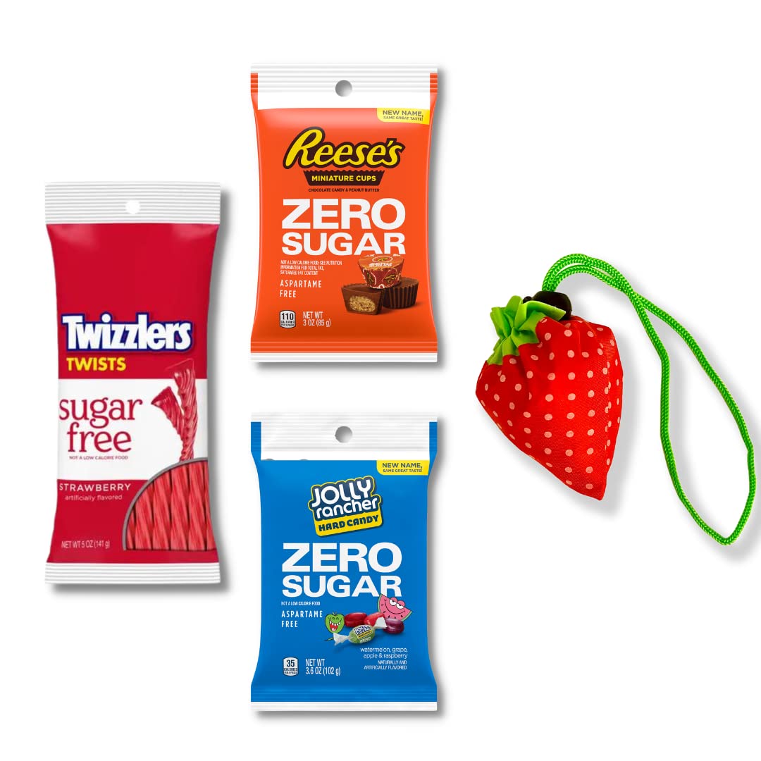 Zero Sugar Hard Candies keto friendly healthy snackThe classic favorite of Reese'sPeanut Butter cups in a delicious sugar free version with about 17 fewer calories. TWIZZLERSStrawberry: Flavored Twists have always been a delicious, low-fat snack. Adding another twist, TWIZZLERS Zero Sugar Strawberry Flavored Twists bring that classic taste you love with none of the sugar. JollyRancher:A bag of sugar-free, individually wrapped fruit-flavored hard candy will keep each delicious piece fresh until it's time for a new bag. Featuring raspberry, apple, grape and watermelon flavors, JOLLYRANCHER Zero Sugar hard candy offers a combination of the undisputed classics you know and love with a sugar- and aspartame-free twist. This no sugar healthy snacks keto value bundle includes Jolly Rancher Sugar Free Hard Candy 3.6oz Bag, Twizzlers sugar Free Strawberry 5oz Theater Bag, reesePeanut Butter Mini Cup Sugar Free 3oz Bag,and a Bonus Grocery Bag.