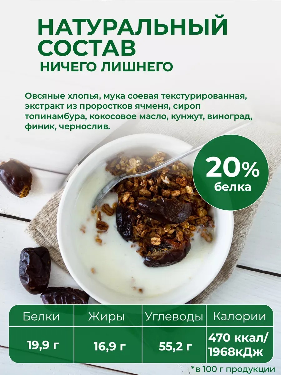 Протеиновая гранола без сахара со вкусом чернослива - это идеальное решение для людей, которые поддерживают свою физическую форму, не отказываясь от полезных сладостей. Запеченная гранола является диетическим продуктом, который подходит для людей, следящих за своей диетой, включая диабетиков, веганов и вегетарианцев. Мюсли запеченные являются натуральным продуктом, который помогает в снижение веса и содержит большое количество протеина, что делает ее идеальным выбором для фитнеса и здорового образа жизни. Кроме того, гранола протеиновая является отличным завтраком для туристов и людей, которые хотят быстро и просто получить здоровый перекус. Такое питание может быть использовано в качестве перекуса для детей, благодаря своему натуральному составу. Наш пп продукт в удобной упаковке 1 кг, позволит Вам наслаждаться им длительное время. Вкусное и полезное питание, содержит в себе меньше калорий, чем обычные вкусняшки. Она также идеально подходит для людей, которые предпочитают постные продукты, так как не содержит ингредиентов животного происхождения. Гранола является прекрасным десертом, также может быть использован в качестве завтрака ПП, кето мюсли или хлопьев фитнес. Например, вы можете добавить эту гранолу в йогурт, смузи или молочные коктейли, чтобы придать им дополнительный белок и вкус. Гранола изготовлена без использования пальмового масла, консервантов, красителей, не содержит ГМО и холестерина. С любовью бренд Древо Жизни Сладень.