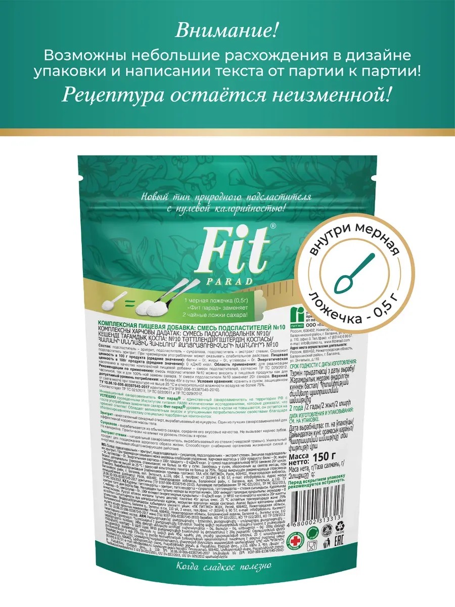 Kcal, fats, carbohydrates, and carbohydrates: 0/0/0/0; includes a 1 g measuring spoon; 1 g of the mixture replaces 20 g of sugar; 1 sachet/stick of the mixture replaces two teaspoons of sugar. The balanced composition of ingredients gives FitParad sugar substitutes an excellent taste, as close as possible to sugar, without an unpleasant aftertaste. The taste does not change during heat treatment, so the sweetener can be used to prepare a wide variety of sweet dishes and desserts. FitParad sweetener consists of natural ingredients: Erythritol is a natural sweetener made from corn starch. One of the best sweeteners for effective weight management. Sucralose is produced from regular sugar and has taste characteristics similar to sugar. It has no calories. Does not cause dental caries. Practically does not affect glucose and insulin levels in the blood. Stevia extract is a natural sweetener obtained from stevia ("honey herb"). In addition to its sweet taste, stevia has a number of beneficial properties: it strengthens blood vessel walls, has a tonic effect on the body, normalizes metabolism, and has a positive effect on intestinal microflora. All ingredients in the product are completely safe and approved by the WHO. FitParad is the only sugar substitute in the Russian Federation that has successfully passed clinical trials at the Institute of Nutrition of the Russian Academy of Medical Sciences. FitParad has been proven not to increase blood insulin levels, which is why it is recommended by endocrinologists. It is an ideal sugar substitute for those monitoring their weight and wanting to lose weight, athletes, and those who advocate a healthy and proper diet. Recommended for patients with type 2 diabetes. Dosage: no more than 45 g per day.