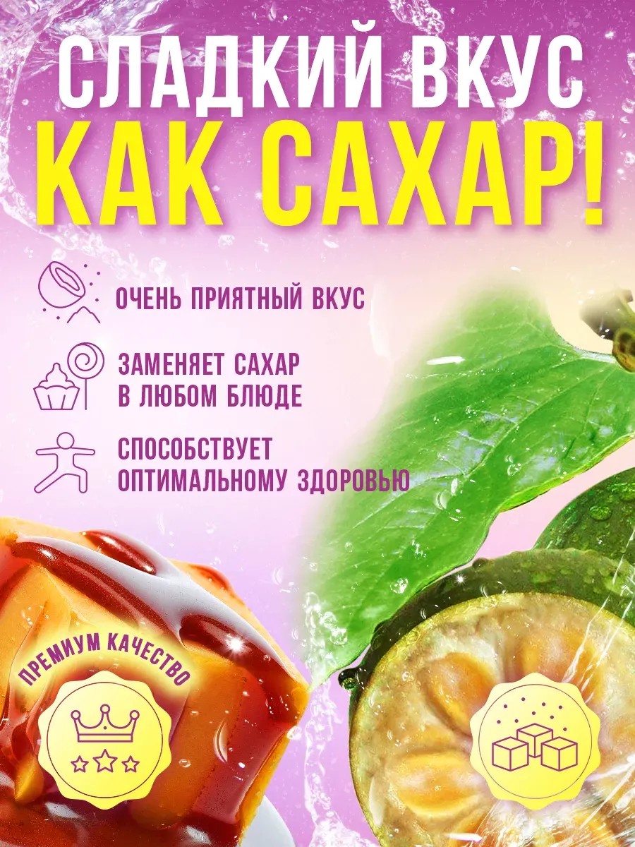 Монк фрукт – это натуральный сахарозаменитель с мягким сладким вкусом, полученный из плодов фрукта монахов (архат). Он не содержит калорий и углеводов, не вызывает скачков сахара в крови, поэтому подходит для диабетиков, кето-диеты и правильного питания. Преимущества: В 3 раза слаще сахара – расходуется экономично Не повышает уровень сахара в крови – безопасен для диабетиков Полностью натуральный продукт – без добавок и консервантов Легко растворяется – подходит для горячих и холодных напитков Чистый сладкий вкус – без горечи и послевкусия Где использовать? Монк фрукт – универсальный подсластитель, который можно использовать в любых блюдах: Чай, кофе, смузи, коктейли Выпечка, десерты, мороженое Йогурты, творог, каши Соусы, заправки, маринады Домашние сладости, варенье, джемы Пропорция замены: 1 г монк фрукта ≈ 3 г сахара. Состав и пищевая ценность (на 100 г) Состав: экстракт фрукта монахов (архат) Калорийность: 0 ккал Белки: 0 г Жиры: 0 г Углеводы: 0 г Как хранить? Хранить в сухом месте при температуре до 25°C. Монк фрукт – сладость без сахара! Добавьте в корзину прямо сейчас!