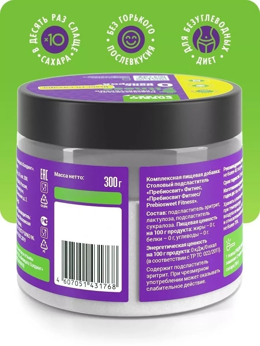 Kcal/calorie/carbohydrate: 0/0/0/0. A set of two 300g jars of Prebiosweet Fitness sweetener. Replaces 6 kg of sugar. Zero calories! Pure taste of sweetness. Prebiosweet Fitness is indispensable for a low-carb keto diet for weight loss and healthy eating, for diabetic healthy eating and cosmetic fasting, and for proper dietary nutrition for athletes. There are various types: stevia, sorbitol, xylitol, allulose. The sweetener comes in tablets, liquid, and powder. But it is recognized that the natural sweetener erythritol, also known as melon sugar, is the safest for health. It does not have the bitterness of stevioside. 1 scoop replaces 2 teaspoons of sugar. This sweetener is completely safe for diets. Prebiosweet Fitness sugar substitute promotes weight loss and healthy eating. This product for diabetics is not only low-calorie, but also contains zero calories. It can be used as a sugar substitute for baked goods, a sweetener for drinks and desserts, an additive to coffee and tea, and sugar-free sweets. It can be added to healthy foods. It is heat-stable. It makes any weight-loss meal healthier and more nutritious. Prebiosweet Fitness contains erythritol, sucralose, and 10% lactulose, known worldwide as the #1 prebiotic. Lactulose stimulates the growth and activity of beneficial intestinal microflora. No sugar.
