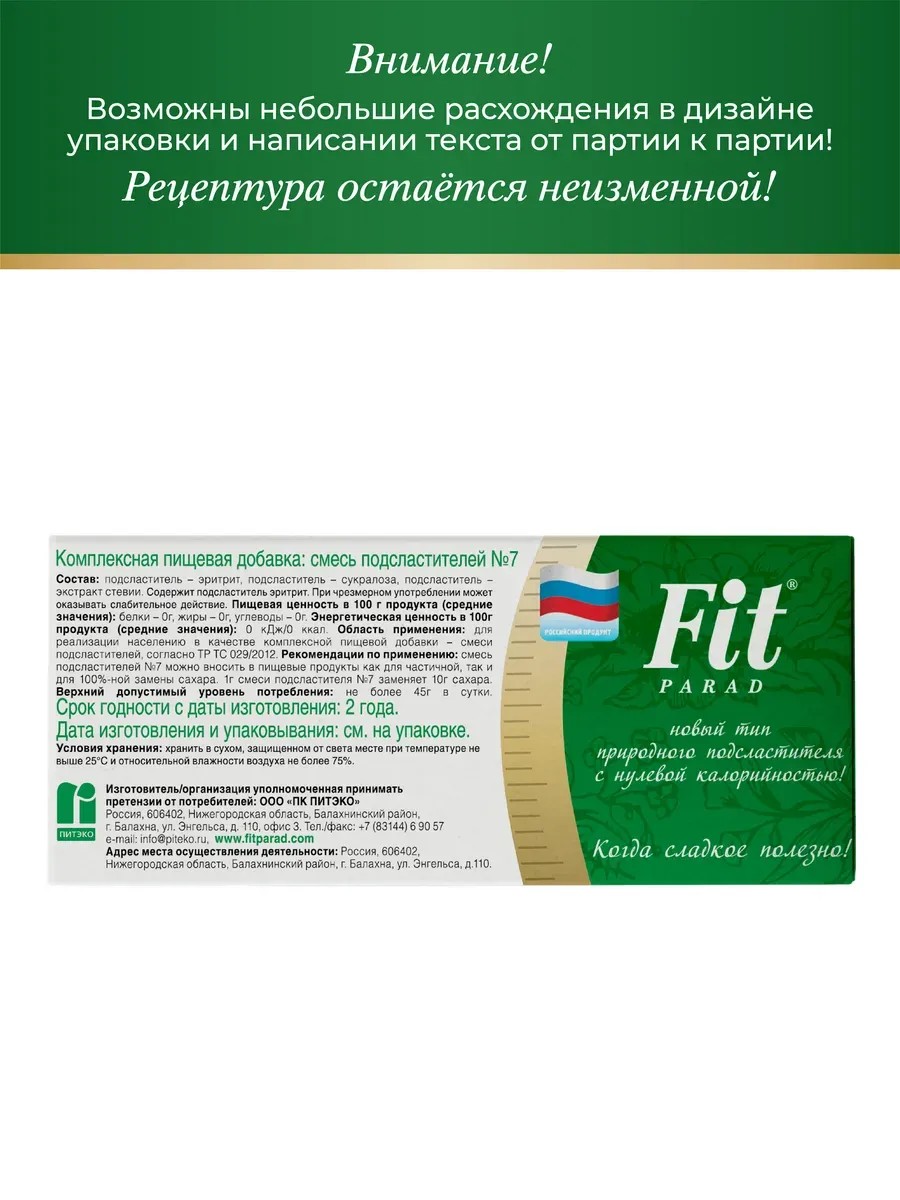 Kcal, fat, carbohydrates (Kcal, fat, carbohydrates): 0/0/0/0; 1 gram of the mixture replaces 10 grams of sugar. The balanced composition of components gives FitParad sugar substitutes an excellent taste, as close as possible to sugar, with no unpleasant aftertaste. The taste does not change during cooking, so the sweetener can be used in preparing a wide variety of sweet dishes and desserts. FitParad sweetener consists of natural ingredients: Erythritol is a natural sweetener made from corn starch. One of the best sweeteners for effective weight management. Sucralose is produced from regular sugar and has taste characteristics similar to sugar. It has no calories. Does not cause dental caries. It has virtually no effect on blood glucose and insulin levels. Stevia extract is a natural sweetener obtained from stevia ("honey grass"). In addition to its sweet taste, stevia has a number of beneficial properties: it strengthens blood vessel walls, has a tonic effect on the body, normalizes metabolism, and has a positive effect on intestinal microflora. All ingredients in the product are completely safe and approved by the WHO. FitParad is the only sugar substitute in the Russian Federation that has successfully passed clinical trials at the Institute of Nutrition of the Russian Academy of Medical Sciences. FitParad has been proven not to increase blood insulin levels, which is why it is recommended by endocrinologists. It is an ideal sugar substitute for those monitoring their weight and wanting to lose weight, athletes, and those who advocate a healthy and proper diet. Recommended for patients with type 2 diabetes. Dosage: no more than 45 g per day.