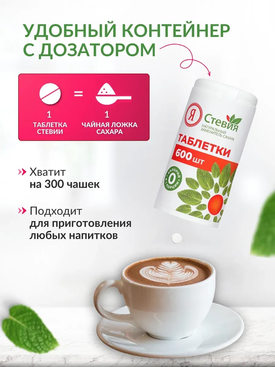 Stevia, a natural sugar substitute in tablet form, 600 tablets. These sweetener tablets are convenient to carry and add to tea or coffee. A stevia tablet is equivalent to 1 teaspoon of sugar. This zero-calorie sweetener is used as a natural low-calorie sweetener to reduce calories in various healthy diets, for weight loss, and for diabetes. Stevia sweetener (steviol glycoside E-960) in tablets is recommended for diabetics. It does not contain saccharin. Stevia, a natural sweetener, is used to sweeten beverages for those who cannot live without sugar. This sugar substitute is suitable for diabetics, vegans, and those on a healthy diet. This natural sweetener (sahzam) is a tabletop substitute, used in place of sugar to impart a sweet taste to beverages such as tea and coffee. Does not contain saccharin.
