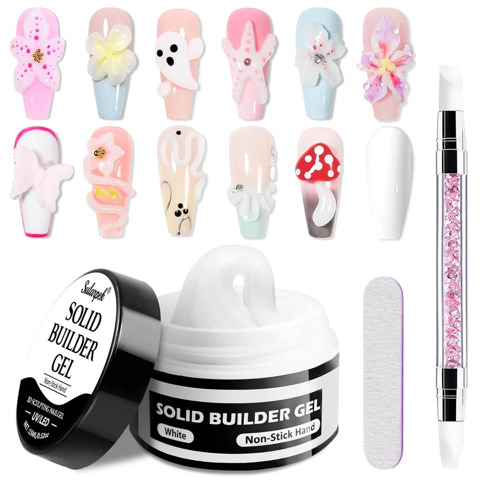 Sularpek Builder Gel combines the ease of application of a traditional gel with the versatility of a nail gel, making your hands more attractive. Features: 1. Strong consistency: easy to mold without slipping or dripping. 2. Non-sticky: won't stick to your hands, making it easy to use and allowing for precise application. 3. This strong builder gel allows you to create elongated nails without complex shapes or tools, ideal for beginners. Multiple uses: Mold extensions: apply the builder gel to a mold to create natural-looking, strong false nails. Amazing 3D designs: sculpt unique designs with the malleable texture of the nail gel. Decorative adhesive: attach gems, rhinestones, and more with this nail gel. Specifications: Color: white. Volume: 15 ml. Package contents: 15 ml of 3D sculpting gel. 1 nail file. 1 silicone nail sculpting tool.Friendly reminder: 1. The gel may become sticky at high temperatures (can be refrigerated for 2-5 minutes). 2. The gel may harden at low temperatures (can be immersed in warm water for about 5 minutes). 3. Due to the gel's composition, slight warming may occur during curing. We recommend shorter, intermittent curing times to minimize discomfort. Wide application: Ideal for beginners and experts alike, this gel is perfect for sculpting, bonding, decorating, shaping, and sculpting nails. A great gift for manicurists or gel enthusiasts. Press the cap down after use to prevent it from drying out. Long-lasting: Its eco-friendly, chip-resistant formula ensures strong, glossy gel nails. With proper care, your gel nails will last for weeks, offering multiple possibilities for your nail art. Easy to use: The solid nail gel has a firm yet non-drying texture. Thanks to its non-stick formula, this Builder Gel allows for precise shaping and easy correction of mistakes. 3-in-1 Builder Gel: includes 15 ml of builder gel (white) for mixing shades or creating unique effects, 1 silicone nail sculpting pen, and 1 nail file. Personalize your creations with rhinestones, glitter, or charms.Sularpek Builder Gel à ongles, gel de construction d'ongles, 3D Sculpting Gels, polygel pour ongles, sculpture d'ongles, design de manucure, peinture à ongles DIY, blanc 15 mlDESCRIPTION DU PRODUIT Le gel Sularpek Builder combine la facilité d'application d'un gel traditionnel avec la polyvalence d'un gel pour ongles, et rend vos mains plus attrayantes. Caractéristiques : 1. Consistance solide : facile à modeler sans glissement ni goutte. 2. Non collant : ne colle pas aux mains, ce qui facilite l'utilisation et permet une application précise. 3. Ce gel constructeur d'ongles solide permet de créer des ongles allongés sans formes ni outils complexes, idéal pour les débutants. Utilisations multiples : Extensions de moule : appliquez le gel de construction des ongles dans un moule pour créer des faux ongles naturels et résistants. Motifs 3D incroyables : sculptez des designs uniques avec la texture malléable du gel à ongles. - Adhésif décoratif : fixez des pierres, des strass et plus encore avec ce gel à ongles. Spécificités : Couleur : blanc. Contenance : 15 ml. Contenu du colis : 15 ml de gel de sculpture 3D. 1 lime à ongles. 1 x silicone pour sculpter les ongles.Rappel amical : 1. Le gel peut devenir collant à haute température (peut être réfrigéré pendant 2 à 5 minutes). 2. Le gel peut durcir à basse température (peut être immergé dans de l'eau chaude pendant environ 5 minutes). 3. En raison de la composition du gel, un léger réchauffement peut survenir pendant le durcissement. Nous recommandons un durcissement plus court et intermittent pour minimiser l'inconfort. Large application : idéal pour les débutants et les experts, ce gel est parfait pour sculpter, coller, décorer, façonner, sculpter les ongles, etc. Cadeau idéal pour les manucures ou les amateurs de gel. Appuyez sur le capuchon après utilisation pour éviter qu'il ne sèche. Longue durée de vie : sa formule respectueuse de l'environnement et anti-éclats garantit des ongles en gel forts et brillants. Avec un entretien approprié, vos ongles en gel dureront des semaines, offrant de multiples possibilités pour votre nail art. Facile à utiliser : le gel à ongles solide a une texture solide mais pas sèche. Grâce à sa formule non adhérente aux mains, ce gel Builder permet de modeler avec précision et corriger facilement les erreurs. Gel Constructeur 3 en 1 : comprend 15 ml de gel constructeur (blanc) pour mélanger des tons ou créer des effets uniques, 1 stylo en silicone pour sculpter les ongles, 1 lime à ongles. Personnalisez vos créations avec des strass, des paillettes ou des breloques.