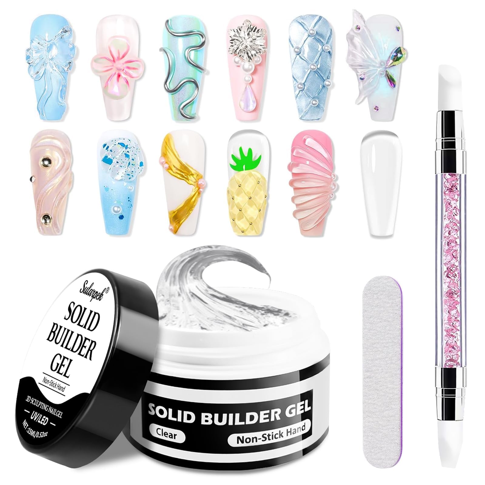 Friendly reminder: 1. The gel may become sticky at high temperatures (can be refrigerated for 2-5 minutes). 2. The gel may harden at low temperatures (can be immersed in warm water for about 5 minutes). 3. Due to the gel's composition, brief warming may occur during curing. We recommend shorter, intermittent curing times to minimize discomfort. Wide application: Ideal for beginners and experts alike, this gel is perfect for sculpting, bonding, decorating, shaping, and sculpting nails. It makes a great gift for manicurists or nail polish enthusiasts. Please tighten the cap after use to prevent it from drying out. Superior durability: Its eco-friendly, break-resistant formula ensures strong, glossy gel nails. With proper care, your gel nails will last for weeks, offering multiple possibilities for your nail art. Easy to use: The solid builder nail gel has a firm yet non-drying texture. Thanks to its non-stick formula, this builder gel allows for precise shaping and easy correction of mistakes. 3-in-1 Builder Gel: Includes 15ml of builder gel (clear) for mixing shades or creating unique effects, 1 silicone nail sculpting pen, and 1 nail file. Personalize your creations with rhinestones, glitter, or charms.Sularpek 15ml Solide Sculpture Builder Gel, 3D Gel Nail Art, Gels Construction Ongle UV, Non-Stick Gels 3D Ongle, pour Extension Décoration et Répare Nail Art, ClairRappel amical : 1. Le gel peut devenir collant à haute température (peut être réfrigéré pendant 2 à 5 minutes). 2. Le gel peut durcir à basse température (peut être immergé dans de l'eau chaude pendant environ 5 minutes). 3. En raison de la composition du gel, un bref réchauffement peut survenir pendant le durcissement. Nous recommandons un durcissement plus court et intermittent pour minimiser l'inconfort. Large application : idéal pour les débutants et les experts, ce gel est parfait pour sculpter, coller, décorer, façonner, sculpter les ongles, etc. Cadeau idéal pour les manucures ou les amateurs de vernis à ongles. Veuillez serrer le couvercle après utilisation pour éviter qu'il ne sèche. Durabilité supérieure : sa formule écologique et anti-casse garantit des ongles en gel forts et brillants. Avec un soin approprié, vos ongles en gel dureront des semaines, offrant de multiples possibilités pour votre nail art. Facile à utiliser : le gel à ongles de construction solide a une texture solide mais pas sèche. Grâce à sa formule non adhérente aux mains, ce gel Builder permet de modeler avec précision et corriger facilement les erreurs. Gel Constructeur 3 en 1 : comprend 15 ml de gel constructeur (transparent) pour mélanger des tons ou créer des effets uniques, 1 stylo en silicone pour sculpter les ongles, 1 lime à ongles. Personnalisez vos créations avec des strass, des paillettes ou des breloques.