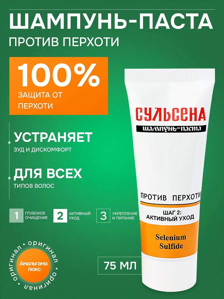 Сульсена шампунь - паста 2 в 1 — удобное и действенное средство против перхоти с мягким очищающим эффектом. В составе — активный компонент дисульфид селена и набор ухаживающих добавок. Формула сочетает свойства лечебной пасты и шампуня, обеспечивая быстрый уход за кожей головы и волосами.