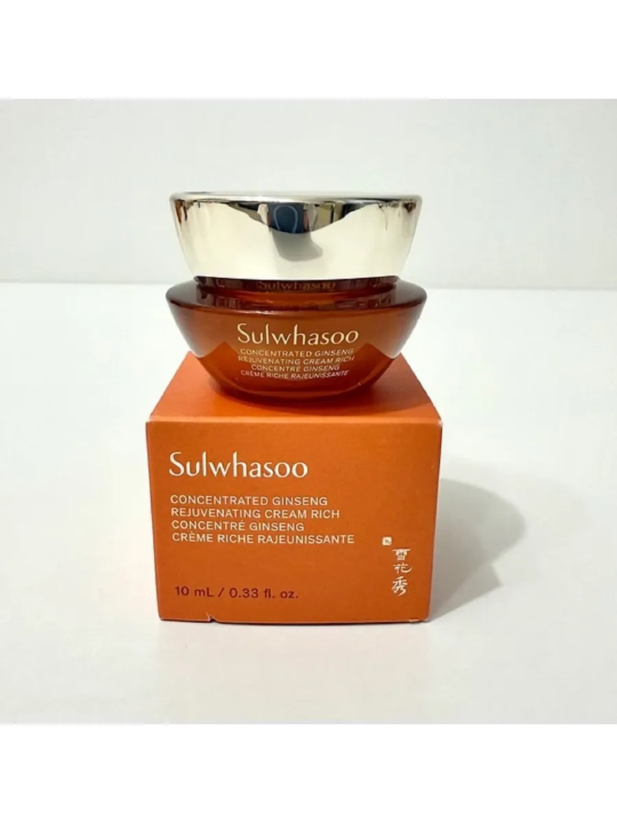 Sulwhasoo Anti-Aging Face Cream (10ml) Concentrated Gineseng Rejuvenating Cream Rich is a unique rejuvenating face cream with concentrated ginseng, using patented Ginsenomics™ technology. Ginsenomics™ is a powerful, active Ginsenoside formula developed by Sulwhasoo to minimize the symptoms of aging. Sulwhasoo uses the rarest type of ginseng, Saponin, enriched more than 6,000 times, to produce Ginsenomics™. With use, a significant improvement in skin condition is noted. The skin becomes hydrated, nourished, dense, and elastic. Elasticity increases and complexion is significantly improved. The skin becomes brighter, dullness and grayness disappear. Turgor is strengthened. Strengthens the walls of blood vessels and capillaries. Controls sebum production. Reduces wrinkles and fine lines, preventing the appearance of new ones. It lifts sagging areas and fills intercellular spaces. It is recommended to warm the cream on your fingertips before applying it to your face using a patting motion. Suitable for all types of mature skin. Ingredients: fermented ginseng root extracts, rare Korean medicinal plants: milkweed, white mulberry, Solomon's seal, sticky rehmannia extract, tiger lily extract, milk peony, Indian lily, hydrolyzed saponin extract, lily of the valley extract, and licorice extract.