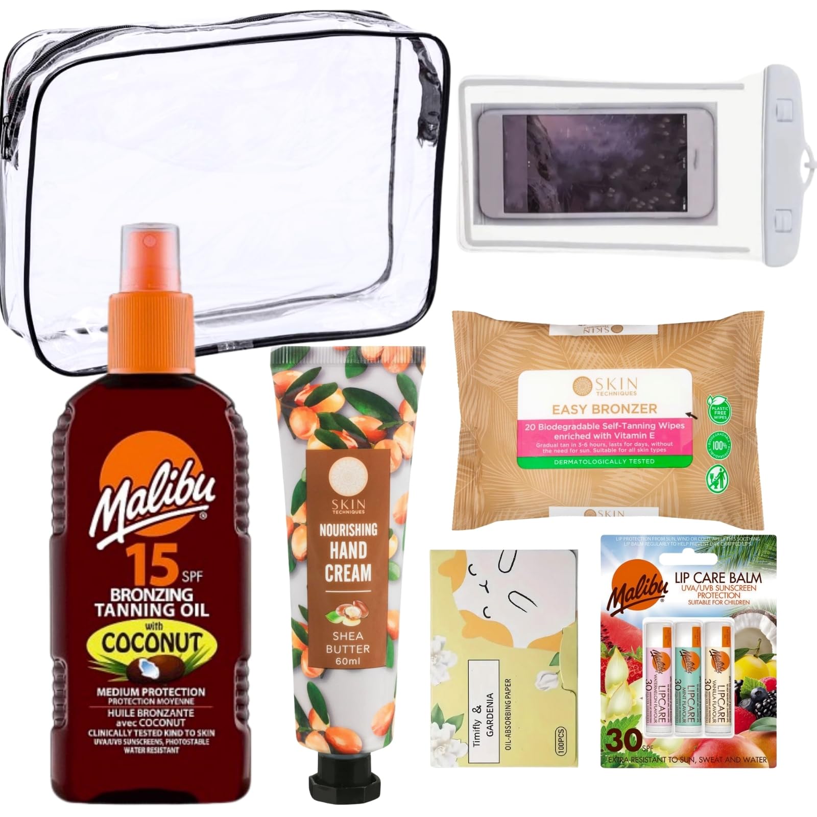 Get ready to soak up the sun in style with our Summer Essentials Travel Toiletries kit, the ultimate companion for sun-kissed adventures! Let your skin shimmer and shine with our SPF 15 Bronzing Tanning Oil, giving you that coveted summer glow while providing sun protection. Keep your lips luscious and protected with our Lip Care Balm SPF 30, ensuring they stay kissably soft throughout your sunny escapades. Wave goodbye to dry hands with our nourishing Hand Cream, because no one likes sandpaper hands at the beach! Say hello to a fresh-faced glow with our Blotting Facial Tissues, perfect for keeping shine at bay so you can sparkle all day. And for those moments when you want an extra boost of bronze, our Self-Tanning Wipes have got you covered, no sun required! Worried about water ruining your phone? Fear not, our Waterproof Mobile Phone Bag ensures your device stays dry and selfie-ready all summer long. Packed with everything you need for fun in the sun, this kit is your ticket to a summer filled with sun, sand, and endless smiles! SAFETY WARNING Cautions: for external use only. Do not apply to broken skin. Keep out of the reach of children. Avoid contact with fabrics and eyes. If contact with eyes occurs, rinse with clean water. If irritation persists, seek medical attention. Malibu recommends SPF 30 and above for children. Protect children with a hat and loose clothes. Keep babies in shade. Seek shade between 11am and 3pm. "Every one’s skin is different and the sun varies in intensity – take care in the sun to avoid over exposure."