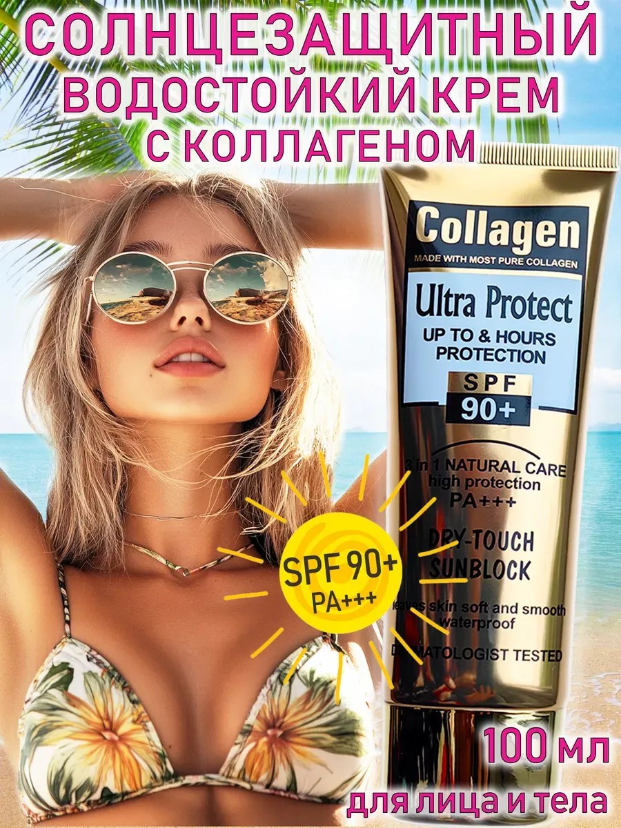 Крем против солнца водостойкий SPF 90, содержащий комплекс солнцезащитных фильтров, эффективно защищает кожу от ультрафиолета (UVA-, UVB-лучей и HEV-излучения), нейтрализует негативное влияние активного солнца и помогает снизить риск ожогов, фотостарения и пигментации. В него входят ухаживающие фотозащитные вещества и коллаген, который питает и увлажняет кожу, снимает сухость и шелушение. Крем для загара с спф spf90 PA+++ не оставляет белых следов, липкого слоя и жирных пятен на коже.