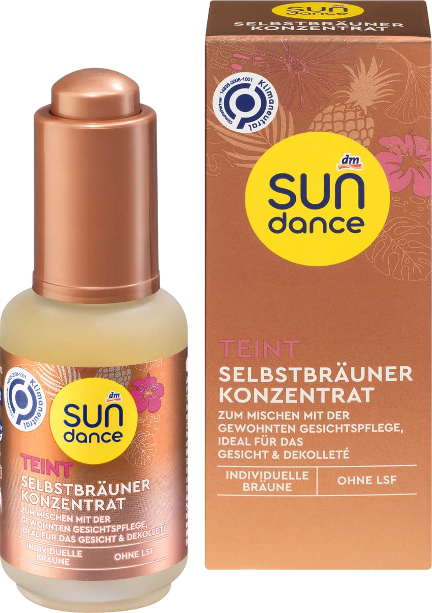 UNDANCE Self-Tanning Concentrate 30ml: Sundance Self-Tanning Concentrate is suitable for mixing with face or body care products. For a radiant complexion and a personalized tan. The tan can be intensified as desired. Skin tolerance is dermatologically tested. Formula free of microplastics and water-soluble synthetic polymers. Storage instructions: Keep the product cool and away from light! Directions for use: Take your usual amount of face care product in your hand. Then add 1 to 5 drops of concentrate and mix well. Apply evenly to cleansed skin and allow to absorb. Avoid the hairline and eyebrows. Avoid contact with eyes. Wash your hands thoroughly afterwards. Suitable for daily use: Depending on the desired intensity, 1 to 3 drops per day to maintain the tan, or up to 5 drops to intensify the tan. Do not use if skin irritation occurs. Caution: Does not contain a UV filter. Does not protect against sunburn. Allow to absorb completely, otherwise contact stains on textiles and surfaces may occur. Do not use before activities requiring increased perspiration. IMPORTANT NOTES: Do not use undiluted! Do not exceed the recommended dose. Ingredients: Aqua, Dihydroxyacetone, Alcohol Denat., Glycerin, Polyglyceryl-4 Caprate, Xanthan Gum, Ethylene Brassylate, Caramel, Citric Acid. Manufactured for: Dm-drogerie markt GmbH, Co. KG, Am dm-Platz 1, 76227 Karlsruhe, Germany. INGREDIENTS Aqua, Dihydroxyacetone, Alcohol Denat., Glycerin, Polyglyceryl-4 Caprate, Xanthan Gum, Ethylene Brassylate, Caramel, Citric Acid DIRECTIONS FOR USE Directions for use: Take your usual amount of facial moisturizer in your hand. Then, add 1 to 5 drops of the concentrate and mix well. Apply evenly to clean skin and allow it to absorb completely. Avoid the hairline and eyebrows. Avoid contact with eyes. Then wash your hands thoroughly. Suitable for daily use: 1 to 3 drops per day depending on the desired intensity to maintain your tan, or up to 5 drops to intensify your tan. If skin irritation occurs, adjust the application accordingly. Caution: Does not contain a UV filter. Does not protect against sunburn. Allow for complete absorption otherwise, contact stains may form on textiles and surfaces. Do not use before activities involving increased perspiration. SAFETY WARNING Avoid contact with eyes and mucous membranes. Apply only to intact skin. Avoid direct sunlight. Store at a temperature not exceeding 25 C. Keep out of reach of children. See moreSkin type: normal all skin types. For a personalized tan. Mix with your usual facial moisturizer. Ideal for the face and décolleté. SPF-free. Sundance Self-Tanning Concentrate 1 x 30 ml.SUN dance Concentré autobronzant à mélanger avec le soin du visage habituel - Idéal pour le visage et le décolleté - 30 mlDESCRIPTION DU PRODUIT DESCRIPTION DU PRODUIT UNDANCE Concentré autobronzant 30 ml : le concentré autobronzant Sundance est adapté pour être mélangé avec un soin du visage ou du corps. Pour un teint éclatant et un bronzage individuel. Le bronzage peut être intensifié selon vos souhaits. La tolérance cutanée est testée dermatologiquement. Formule sans microplastiques ni polymères synthétiques solubles dans l'eau. Conseils de conservation : conserver le produit au frais et à l'abri de la lumière ! Conseils d'utilisation : prenez votre quantité habituelle de soin du visage dans la main. Ajoutez ensuite 1 à 5 gouttes de concentré et mélangez bien les deux. Appliquer uniformément sur la peau nettoyée et laisser pénétrer. Évitez la racine des cheveux et les sourcils. Évitez tout contact avec les yeux. Lavez-vous ensuite soigneusement les mains. Convient pour une utilisation quotidienne : selon l'intensité désirée, 1 à 3 gouttes par jour pour préserver le bronzage, ou jusqu'à 5 gouttes pour intensifier le bronzage. Ne pas utiliser en cas d'irritation de la peau. Attention : ne contient pas de filtre de protection UV. Ne protège pas contre les coups de soleil. Laisser pénétrer complètement, sinon des taches de contact sur les textiles et les surfaces sont possibles. Ne pas utiliser avant les activités nécessitant une transpiration accrue. REMARQUES IMPORTANTES : ne pas utiliser le produit non dilué ! Ne pas dépasser la dose recommandée. Ingrédients : aqua, dihydroxyacétone, alcool dénat., glycérine, polyglyceryl-4 caprate, gomme xanthane, éthylène brassylate, caramel, acide citrique. Fabriqué pour : Dm-drogerie markt GmbH, Co. KG, Am dm-Platz 1, 76227 Karlsruhe. INGRÉDIENTS Aqua, Dihydroxyacetone, Alcohol Denat., Glycerin, Polyglyceryl-4 Caprate, Xanthan Gum, Ethylene Brassylate, Caramel, Citric Acid. MODE D'EMPLOI Conseils d'utilisation : prenez votre quantité habituelle de soin du visage dans votre main. Ensuite, ajoutez 1 à 5 gouttes du concentré et mélangez bien les deux. Appliquez uniformément sur une peau propre et laissez-la bien absorber. Évitez la racine des cheveux et les sourcils. Évitez tout contact visuel. Lavez-vous ensuite soigneusement les mains. Convient pour un usage quotidien : 1 à 3 gouttes par jour selon l'intensité souhaitée pour préserver le bronzage ou jusqu'à 5 gouttes pour intensifier le bronzage. Pour les irritations de la peau, réglez l'application. Attention : ne contient pas de filtre de protection UV. Ne protège pas contre les coups de soleil. Permettre à l'absorption complète, sinon la formation de taches de contact sur les textiles et les surfaces est possible. Ne pas utiliser avant les activités avec une transpiration accrue. AVERTISSEMENT DE SÉCURITÉ Évitez tout contact avec les yeux et les muqueuses. Évitez uniquement sur une peau intacte. Éviter l'exposition directe au soleil. Conserver à une température ne dépassant pas 25 C. Tenir hors de portée des enfants Voir plusType de peau : normale tout type de peau. Pour un bronzage individuel. À mélanger avec le soin du visage habituel. Idéal pour le visage et le décolleté. Sans SPF. Sundance Concentré autobronzant 1 