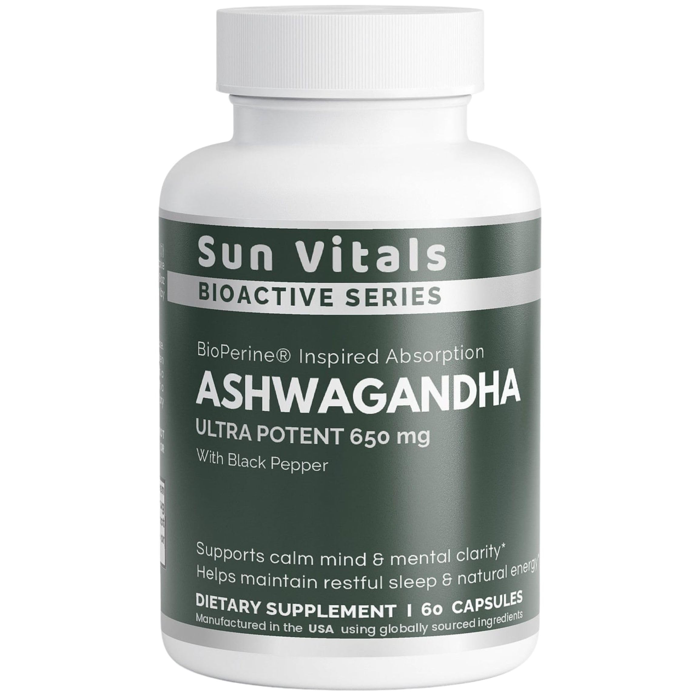 Sun Vitals Ashwagandha Ultra Potent 650 mg Organic Ashwagandha Root with Black Pepper 60 Vegan Capsules