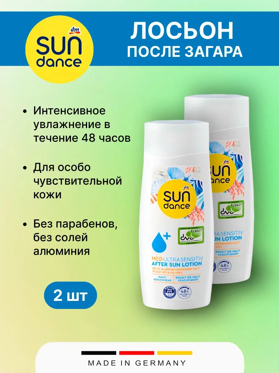 Лосьон после загара SUNDANCE MED, 200 мл - это интенсивное увлажняющее средство для аллергической кожи продолжительностью 48 часов. В качестве средства ухода после принятия солнечных ванн он успокаивает и поддерживает регенерацию кожи. Лосьон обеспечивает бархатисто-мягкую и эластичную кожу, а также оказывает длительное противодействие обезвоживанию кожи. Применение: Обильно нанесите на очищенную кожу после принятия солнечных ванн. Не наносите на воспаленные участки кожи. Легко распределяется и быстро впитывается, не оставляя жирной пленки.