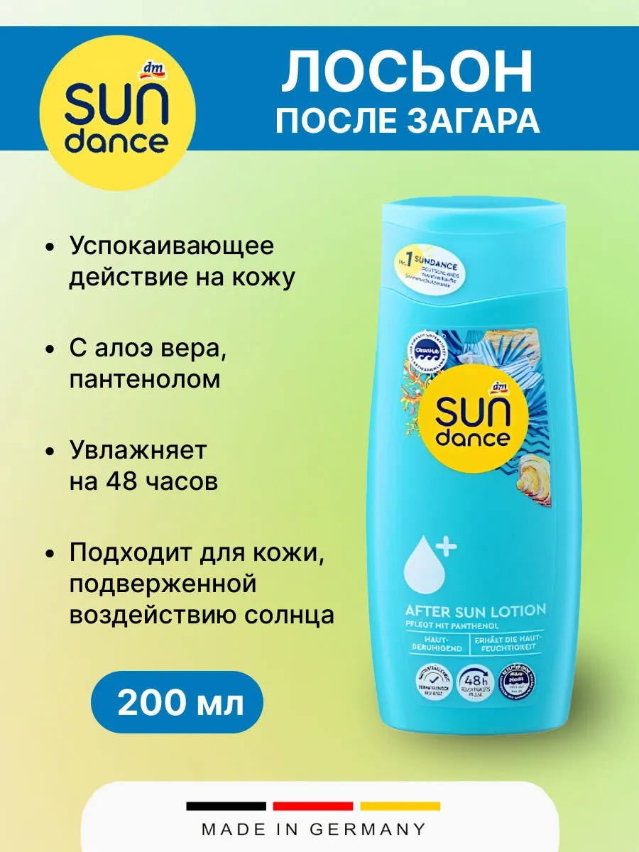 Лосьон после загара SUNDANCE, 200 мл оказывает успокаивающее и увлажняющее действие на кожу. Сбалансированная формула для ухода с алоэ вера, пантенолом и бисабололом оказывает успокаивающее действие на загорелую и сухую кожу. Интенсивные увлажняющие средства оказывают гармоничное воздействие на естественный баланс влаги в коже. Для бархатисто-мягкой кожи. Кожная переносимость подтверждена дерматологически. Применение: Обильно нанесите на очищенную кожу после принятия солнечных ванн. Легко наносится и быстро впитывается, не оставляя жирной пленки. Оказывает успокаивающее действие на кожу, подверженную воздействию солнца. Для бархатисто-мягкой кожи.