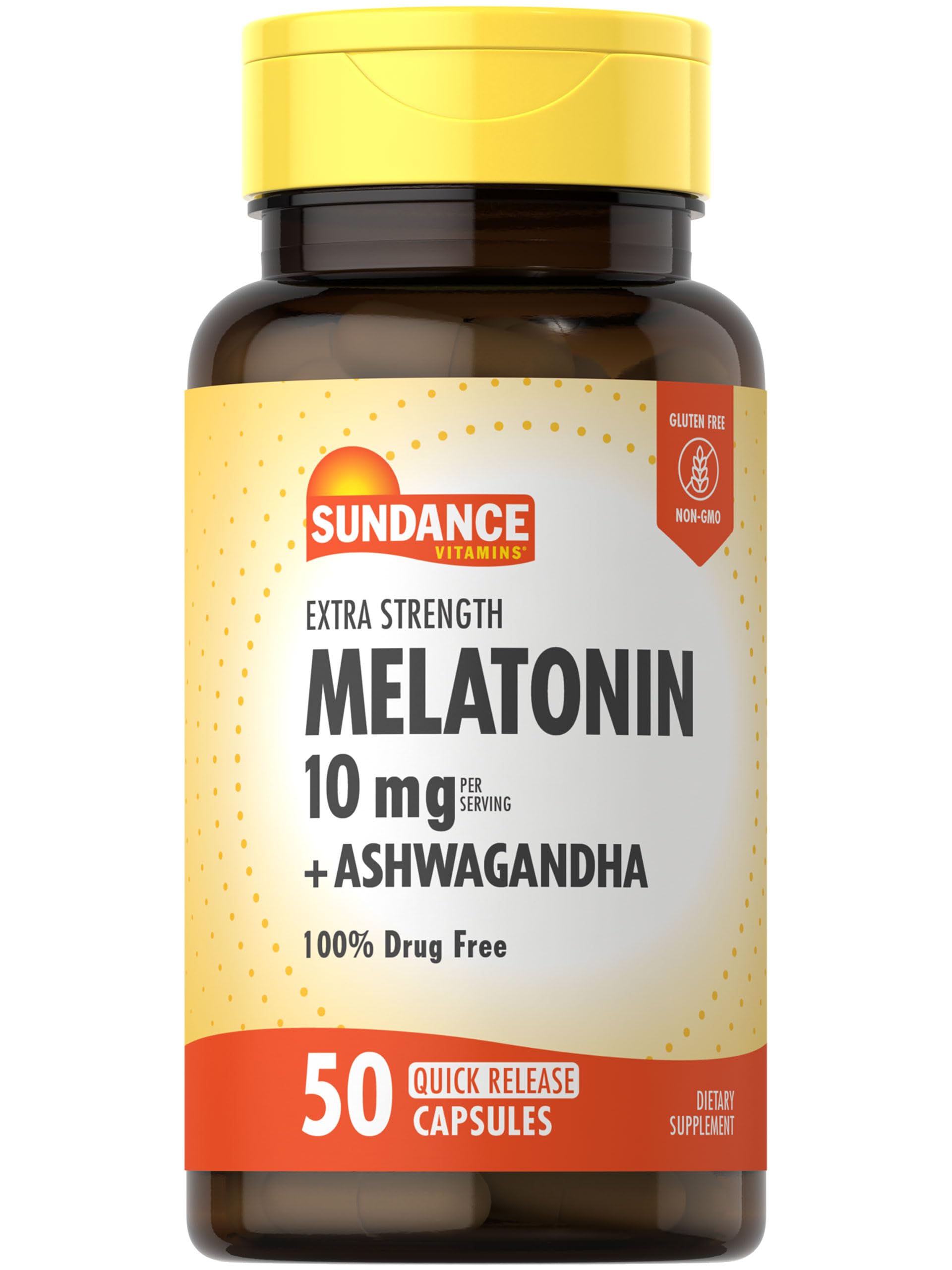 Melatonin Ashwagandha Quick Release Capsules Melatonin is a naturally occurring hormone within the body that may begin to decline with age. Many people rely on a Melatonin supplement for reliable support. While Ashwagandha is a traditional herb touted for its naturally occurring phytonutrients. Our Extra Strength Melatonin and Ashwagandha capsules provide a wonderful addition to your nighttime routine, delivering 10 mg of Melatonin and 75 mg of Ashwagandha Extract in each serving. Sundance Vitamins: Let Your Health Shine Add a little sunshine to your day with high-quality vitamins and supplements from Sundance. With affordably priced supplements available in various delivery forms like capsules, softgels, chewables, tablets, liquids, and gummies, there's an option for everyone. Our Melatonin Ashwagandha is non-GMO, and free of gluten, wheat, yeast, milk, lactose, soy, artificial color, artificial flavor, artificial sweetener, and preservatives.NATURALLY FREE OF: Gluten, Wheat, Milk, Lactose, Soy, Artificial Sweetener Flavor, and Non-GMO. VALUE FOR LESS: High-quality vitamins and supplements at affordable, family-friendly prices. PRODUCTS YOU CAN TRUST: All products undergo rigorous testing to prioritize quality and safety. QUICK RELEASE CAPSULES: Add two easy-to-take quick release capsules to your nighttime routine. EXTRA STRENGTH FORMULA: Receive Melatonin and Ashwagandha in one combined formula.