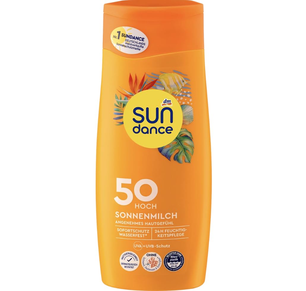 24-hour moisturizing care with immediate protection against UVA and UVB rays. SUNDANCE vegan sunscreen SPF 50 leaves the skin feeling comfortable, prevents premature light-induced aging and pigment spots with regular use, and also provides 24-hour moisturizing care. Skin compatibility dermatologically tested. Water-resistant. Vegan. DIRECTIONS FOR USE Apply for continuous protection. Reapply after swimming or sweating. SAFETY WARNING Avoid contact with clothing, fabrics, and surfaces. Permanent contact marks or changes may occur even after complete absorption. Apply sunscreen liberally before sun exposure. Small amounts significantly reduce the protection. Reapply frequently to maintain protection, especially after sweating or swimming and toweling. Avoid intense midday sun. Protect babies and toddlers from direct sunlight, wear a sunscreen with a high SPF (SPF greater than 25), and wear protective clothing. Even sunscreens with high SPFs don't offer complete protection against UV rays. Despite using sunscreen, don't stay in the sun for too long. Every sunburn causes lasting skin damage and should be avoided. Excessive sunbathing poses a serious health risk. Avoid contact with eyes. Apply only to intact skin. Allow sunscreen to fully absorb, especially before entering the water. See more.Sun milk SPF 50 , 200ml, 200ml.SUNDANCE Zonnemelk SPF 50 , 200 ml 24 uur hydraterende verzorging onmiddellijke bescherming tegen UVA UVB-stralen. De veganistische zonnemelk SPF 50 van SUNDANCE geeft een aangenaam huidgevoel, voorkomt bij regelmatig gebruik voortijdige, door licht veroorzaakte huidveroudering en pigmentvlekken en fungeert bovendien als 24 uur hydraterende verzorging. Huidvriendelijkheid dermatologisch getest. Waterbestendig. Veganistisch. GEBRUIKSAANWIJZING Toepassen voor continu bescherming. Herappleren na zwemmen of zweeten. VEILIGHEIDSWAARSCHUWING Vermijd contact met kleding, textiel en oppervlakken. De vorming van permanente contactvlekken of veranderingen is ook na volledig intrekken mogelijk. Breng de zonnebrandcrème royaal aan voordat je in de zon bent. Kleine hoeveelheden verminderen de beschermingsprestaties aanzienlijk. Meervoudig aanbrengen om de bescherming te behouden, vooral bij het zweten of na het zwemmen en afdrogen. Vermijd intensieve middagzon. Bescherm baby's en peuters tegen direct zonlicht, zonnebrandcrème met een hoge beschermingsfactor (LSF groter dan 25) en beschermende kleding gebruiken. Ook zonnebrandmiddelen met hoge beschermingsfactoren bieden geen volledige bescherming tegen uv-stralen. Blijf ondanks het gebruik van een zonnebrandmiddel niet te lang in de zon. Elke zonnebrand beschadigt de huid duurzaam en moet worden vermeden. Overmatig zonnebaden vormt een ernstig gezondheidsrisico. Vermijd contact met de ogen. Alleen op intacte huid aanbrengen. zonnebrandcrème volledig laten intrekken, vooral voordat je in het water bent. Meer bekijkenZonnemelk SPF 50 , 200ml, 200ml.
