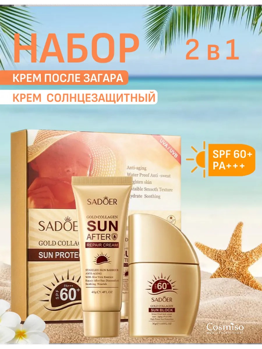 Набор солнцезащитных кремов от загара и после загара Sadoer Gold с коллагеном 2 штуки. Набор увлажняющих солнцезащитных кремов от загара и после загара с коллагеном включает в себя два крема с нежным ароматом и легкой текстурой, позволяющей средствам быстро впитываться, не оставляя липкой пленки на поверхности кожи и чувства стянутости. В составе кремов содержится золотой коллаген, который регенерирует клетки, ускоряя обменные процессы и улучшая циркуляцию крови, благодаря чему кожа приходит в тонус, становится более плотной, упругой и эластичной, разглаживаются морщинки.