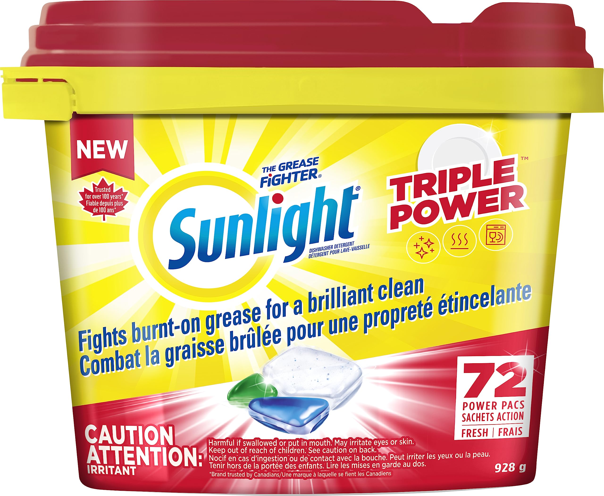 Sunlight Triple Power dishwasher detergent fights burnt-on grease for a brilliant clean.Leaves Dishwasher Clean Fresh. Virtually Spotless Dishes. Powers Away 24hr Stuck-on Food. Cleans Without Pre-washing. Our Best Overall Cleaning Power.