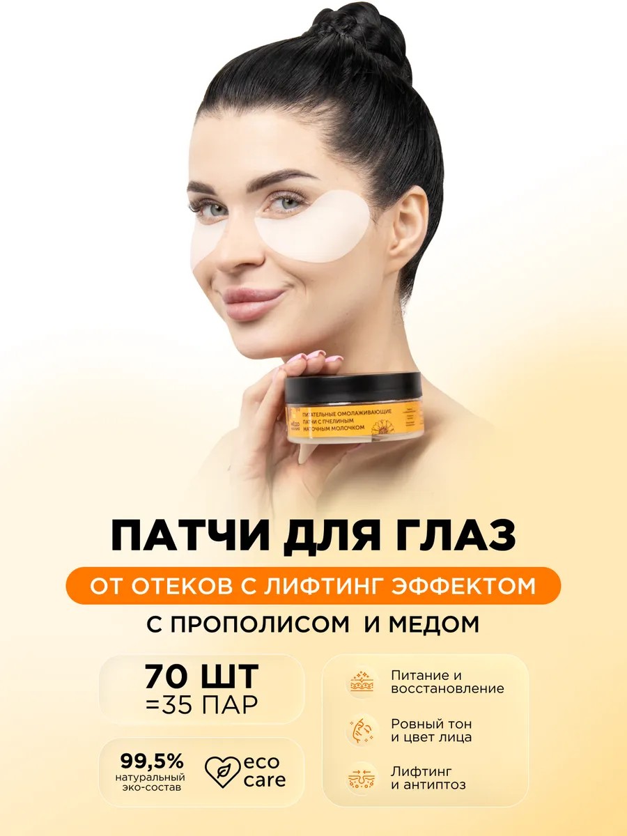 Омолаживающие патчи для области вокруг глаз с лифтинг эффектом. Содержат пчелиное маточное молочко и коллаген, которые сделают вашу кожу упругой и эластичной. Быстро и бережно вы избавитесь от морщин, темных кругов, мешков и отеков под глазами. Вернут здоровье и молодость вашей коже. Действуют нежно и мягко, не вызывают раздражения, зуда или покраснений.