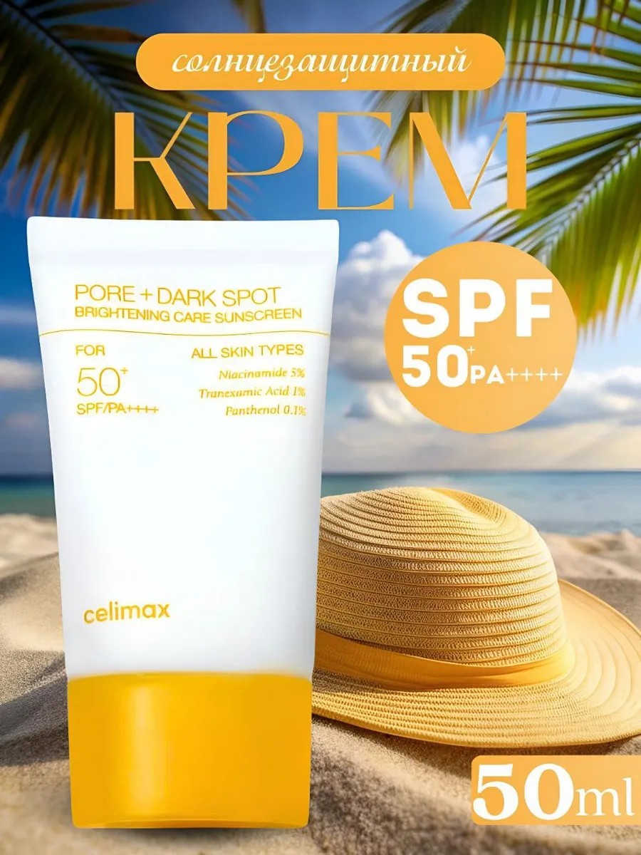 Celimax Pore + Dark Spot Sun Cream SPF 50+ солнцезащитный крем с мощной защитой от UVA и UVB-лучей — осветляет пигментацию предотвращает появление пятен — дарит сияние коже