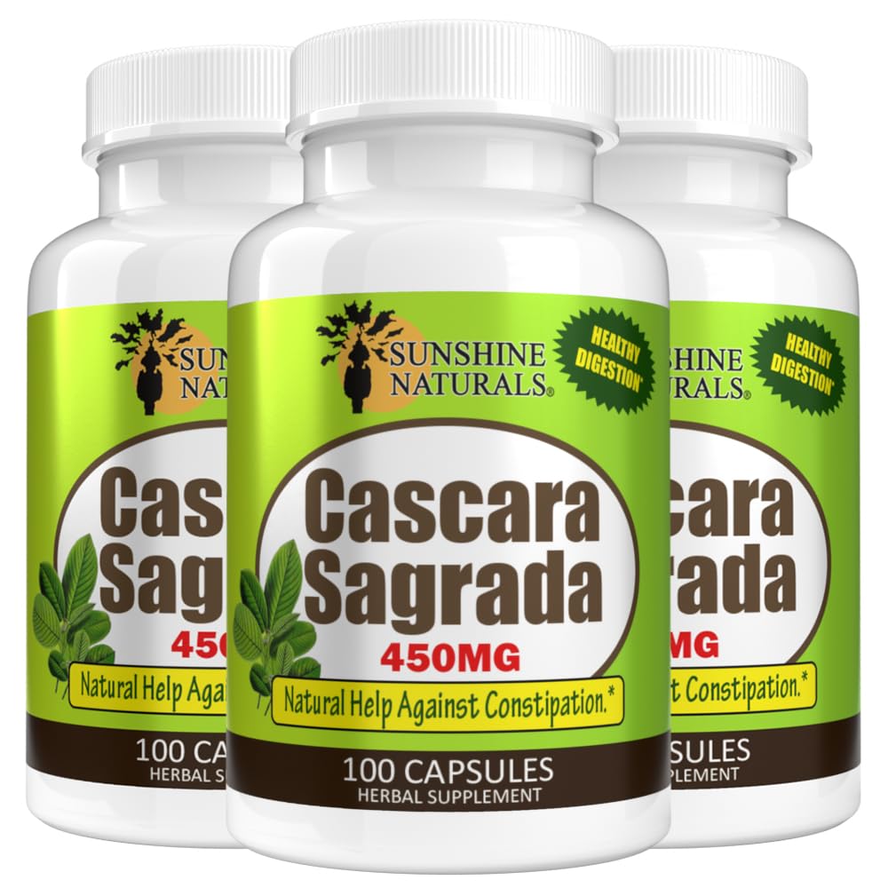 Sunshine Naturals Cascara Sagrada 450 Mg Herbal Digestive Support & Gentle Laxative for Occasional Constipation Natural Colon Cleanse 100 Capsules Made in USA Pack 3