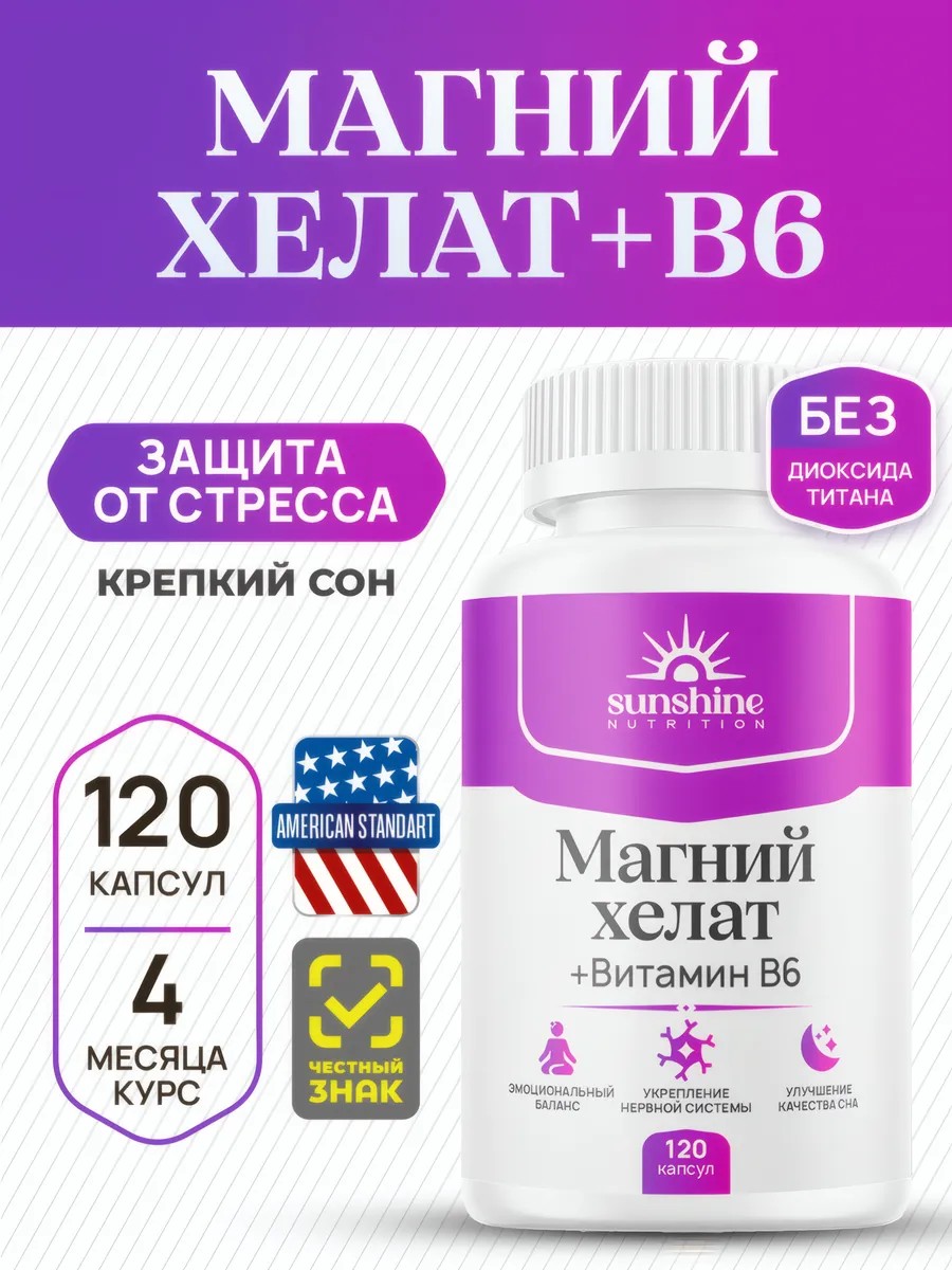 | Полное наименование товара | Sunshine Nutrition Magnesium Chelate B6 600 mg 120 caps |