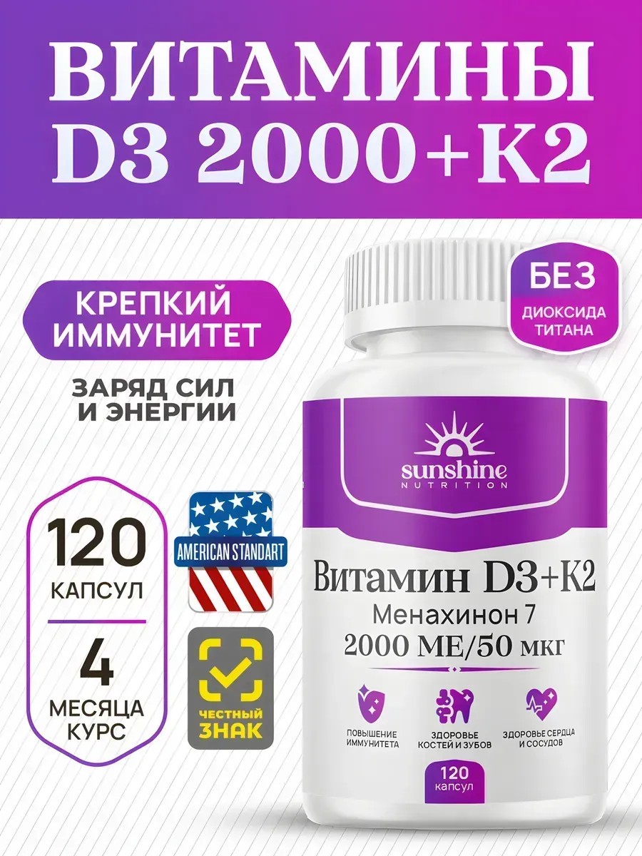 | Полное наименование товара | Sunshine Nutrition Vitamin D3 2000 + К2 МК-7 120 caps |