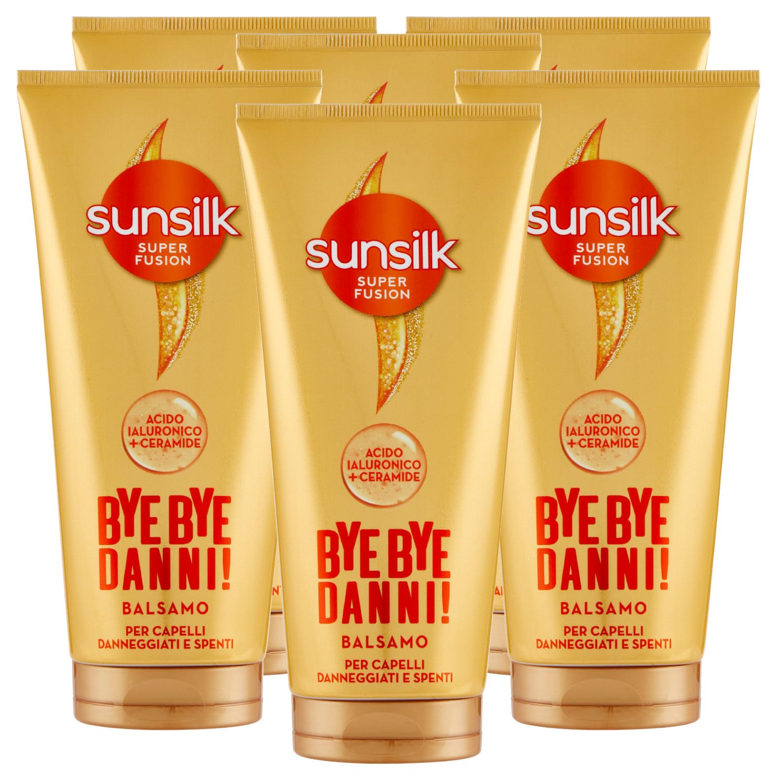 Strengthens the cuticles and makes hair 10 times stronger and shinier. Deeply hydrates and nourishes and strengthens. Super Fusion formula enriched with hyaluronic acid and ceramides. Balm with a specific repairing action for damaged and dull hair. The kit contains: 6 bottles of Sunsilk Bye Bye Bye Damage Hair Balm, 180 ml each.