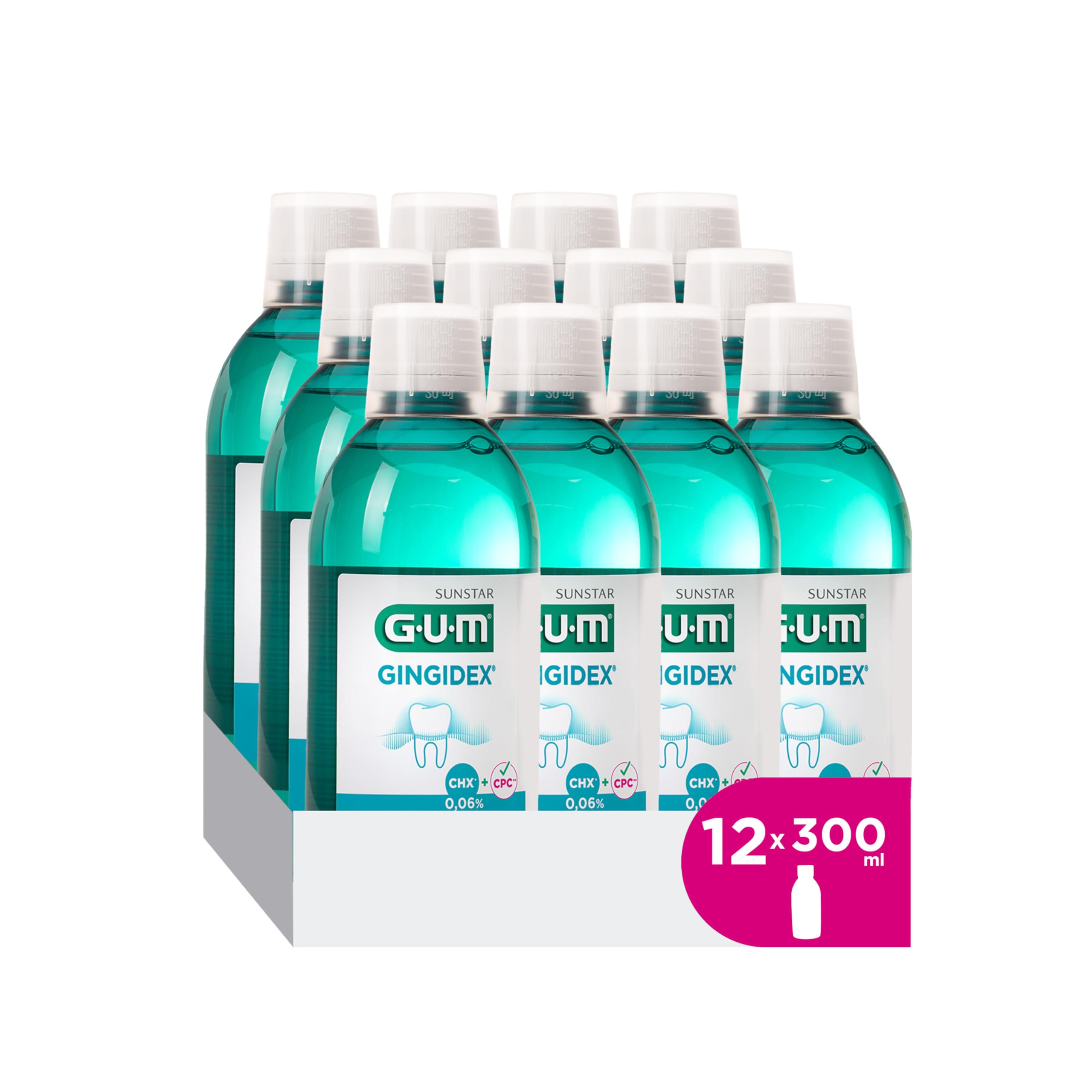The FRESH PEPPERMINT FLAVOR leaves your mouth feeling really clean. IDEAL FOR THE FIRST SIGNS OF GUM SENSITIVITY and in the maintenance phase after periodontal treatment. GENTLE FORMULA is alcohol-free and ready to use without dilution. DOUBLE ANTI-PLAQUE SYSTEM with Chlorhexidine Digluconate Cetylpyridinium Chloride attacks existing plaque and has a dual antiseptic effect to prevent the growth of bacteria. ADVANCED GUM CARE mouthwash helps soothe sensitive gums and maintain healthy gums.GUM GINGIDEX 0,06 Chloorhexidine Mondspoelmiddel geavanceerde tandvleesverzorging dubbele antiplak werking verzacht gevoelig tandvlees alcoholvrij 12 x 300ml 12x300mlDe FRISSE PEPERMUNT SMAAK laat uw mond echt schoon aanvoelen. IDEAAL VOOR DE EERSTE SIGNALEN VAN TANDVLEES SENSITIVITEIT en in de onderhoudsfase na een parodontale behandeling. ZACHTE FORMULE is alcoholvrij en gebruiksklaar zonder verdunning. DUBBEL ANTIPLAK SYSTEEM met Chloorhexidine Digluconaat Cetylpyridinium Chloride valt bestaande tandplak aan en heeft een tweevoudige antiseptische werking om de groei van bacteriën te voorkomen. ADVANCED GUM CARE mondwater helpt gevoelig tandvlees te verzachten en gezond tandvlees te behouden.