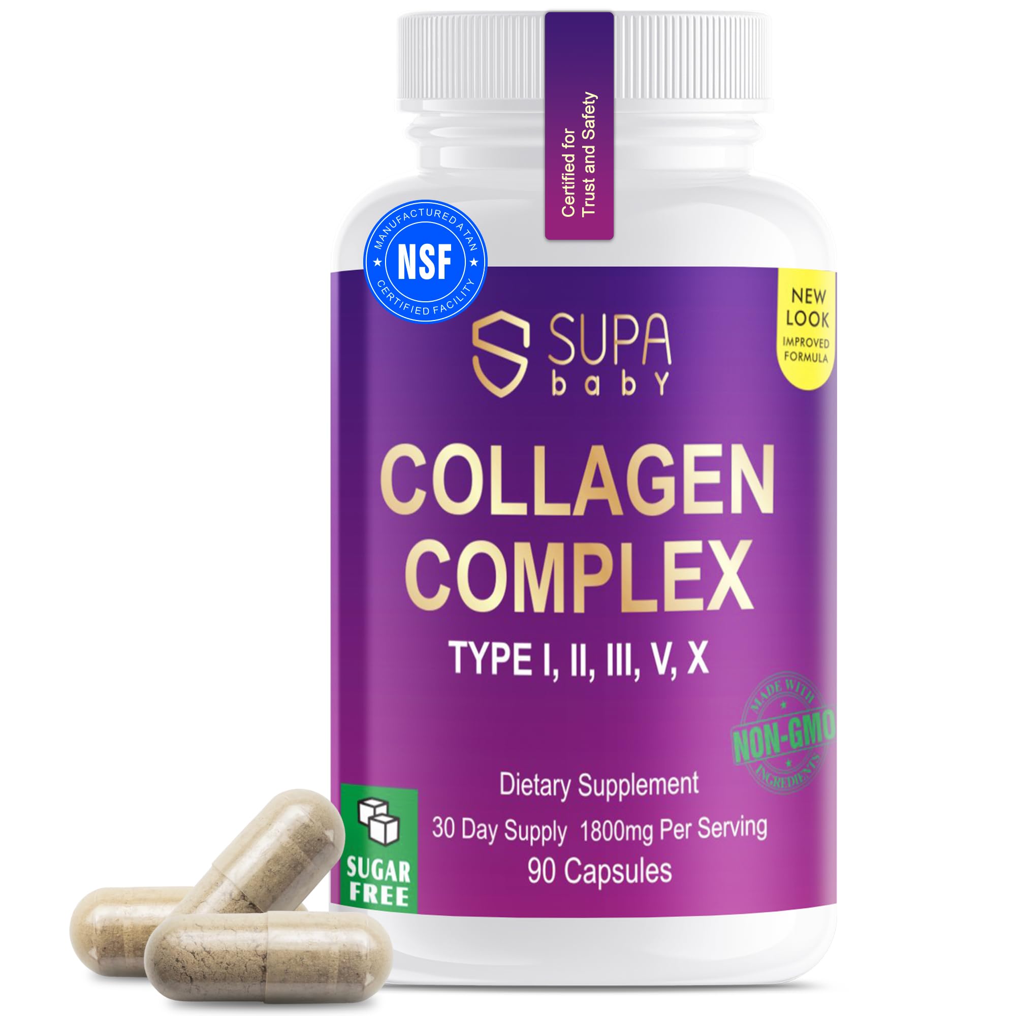 Trusted Quality, Backed by Certification Crafted in NSF-certified U.S. facilities and third-party tested for safety and purity. Each bottle provides a full 30-day supply in easy-to-swallow capsules you can trust. Daily Beauty Recovery Partner Helps reduce fine lines, strengthen nails, and support joint health—whether for beauty routines or fitness recovery. A versatile supplement for modern wellness needs. Clean, Hydrolyzed, and Highly Absorbable Hydrolyzed collagen peptides for fast, efficient absorption—up to 98 . Vegan capsules are non-GMO, sugar-free, gluten-free, and dairy-free. Gentle on digestion, great for daily wellness. Age Gracefully with Women-Focused Support Types I III support smoother skin and youthful glow, while Type II helps maintain joint comfort and mobility. Ideal for active lifestyles and natural anti-aging routines. High-Potency Collagen Complex – 1800mg Per Serving SUPABABY Formulated with Types I, II, III, V, and X collagen peptides to target skin elasticity, joint flexibility, and bone density. One powerful blend, three essential benefits.